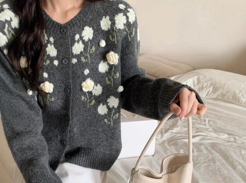 The flowers are crafted using a combination of 3D flocking and jacquard technology. The flat jacquard pattern, interwoven with different colored yarns, creates the outlines of flowers and leaves on the sweater’s surface, creating a delicate and layered pattern. The three-dimensional flowers, created through a special flocking process, rise from the sweater’s surface, creating a three-dimensional effect. They feel soft and springy to the touch, and visually appear lifelike, resembling real flowers blooming on the sweater itself, greatly enhancing the sweater’s artistic appeal and distinctiveness.