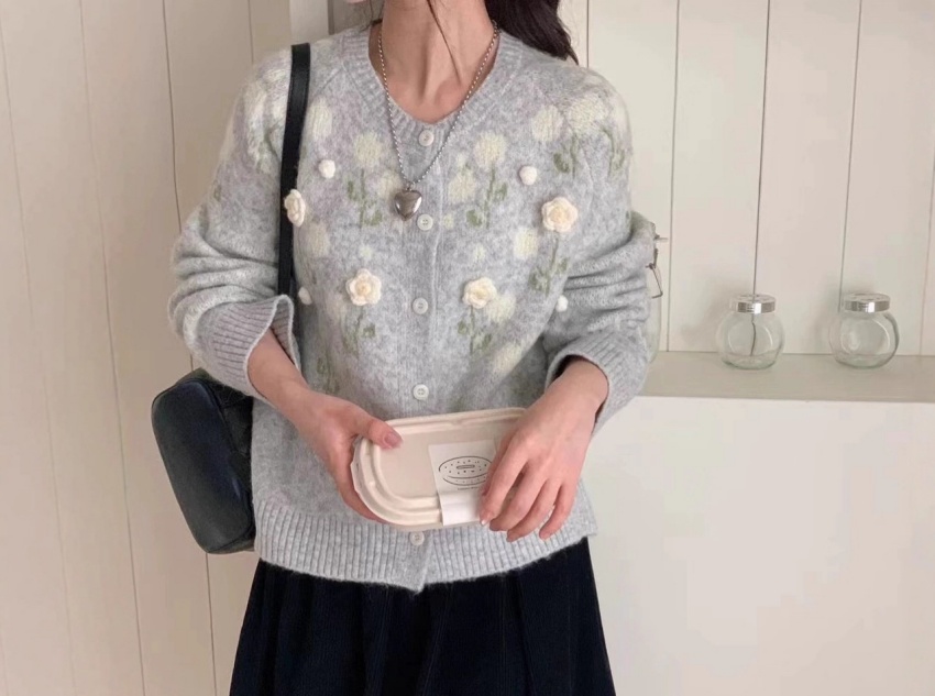 The precision knitting process results in even and fine stitching, ensuring the sweater’s overall structure is solid and durable, resisting deformation. The cardigan’s buttons are a vintage-inspired design that complements the cardigan’s style, blending seamlessly into the overall design and showcasing premium quality in every detail. The main body of the sweater is made of plain knit, ensuring the fabric’s smoothness and the floral pattern’s clarity. Ribbed cuffs and hem offer excellent elasticity, preventing deformation and creating a visually cohesive detail, further enhancing the sweater’s design.