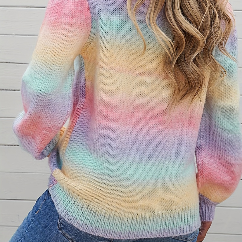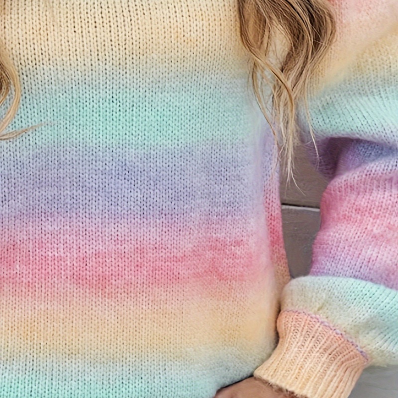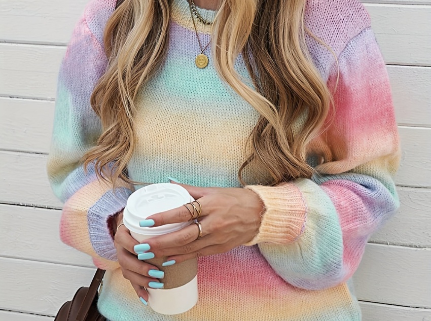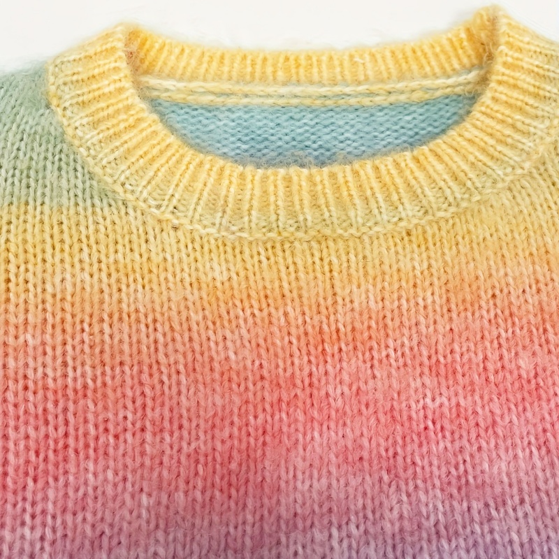 It features a macaron-inspired rainbow gradient color scheme, with soft, low-saturation tones like light pink, light yellow, mint green, and lavender transitioning seamlessly, breaking the dullness of traditional solid-color sweaters. The rich, delicate transitions between colors resemble a spring rainbow woven into the sweater. While retaining the vibrant energy of the rainbow, the softer tones lend a touch of gentle elegance, creating a sweet yet refreshing effect. It’s flattering on all skin tones, brightening the complexion and adding a sense of vitality.