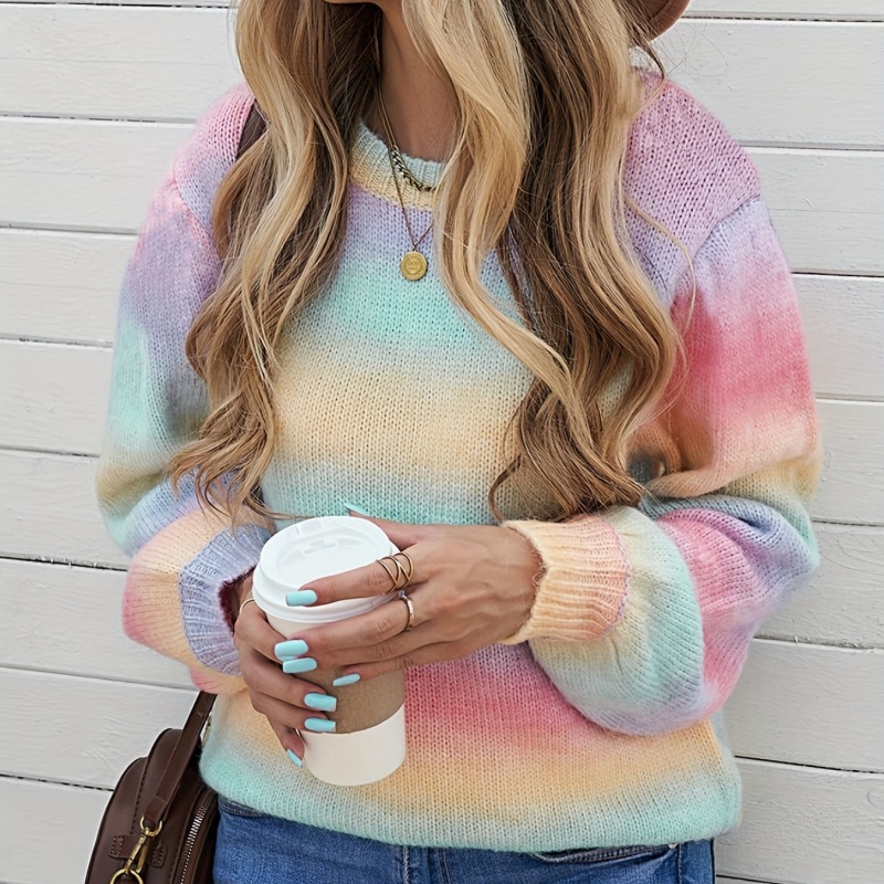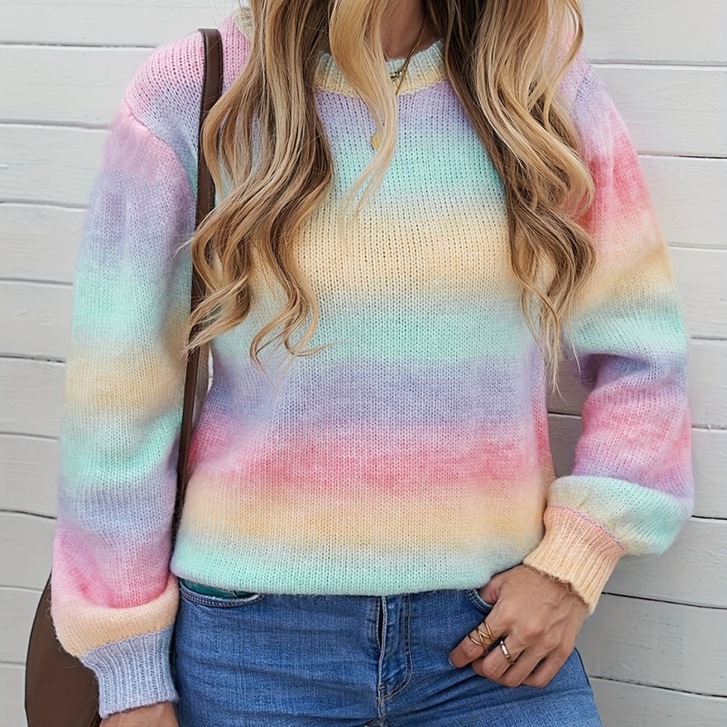 This rainbow gradient round neck women's sweater uses soft rainbow gradient colors as a visual highlight to break the monotony; the blended knitted fabric ensures skin-friendliness and warmth, making it comfortable to wear; the gradient dyeing and ribbed groove technology reflect the exquisiteness and practicality of the design, which is both beautiful and durable; the loose round neck and dropped shoulder version has excellent inclusiveness and is suitable for a variety of body shapes and styles; its adaptability to multiple scenes makes it a versatile item in the wardrobe, whether it is leisure, commuting or dating, it can be easily controlled. It is a knitted item that perfectly combines fashion, comfort and practicality.