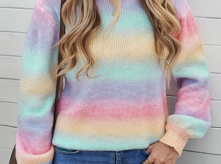 It features a macaron-inspired rainbow gradient color scheme, with soft, low-saturation tones like light pink, light yellow, mint green, and lavender transitioning seamlessly, breaking the dullness of traditional solid-color sweaters. The rich, delicate transitions between colors resemble a spring rainbow woven into the sweater. While retaining the vibrant energy of the rainbow, the softer tones lend a touch of gentle elegance, creating a sweet yet refreshing effect. It’s flattering on all skin tones, brightening the complexion and adding a sense of vitality.