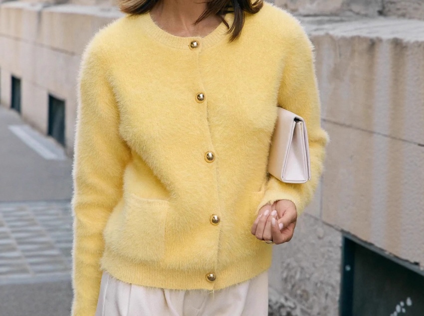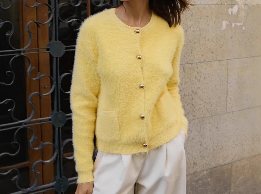 This cardigan utilizes a fine knitting technique with even, dense stitching, ensuring the fabric’s firmness and durability, making it less prone to unraveling and warping. The metal buttons on the placket are not only a practical closure but also a decorative accent. The metallic luster creates a textural contrast with the warm yellow fabric, সামগ্রিক পরিশীলিততা বৃদ্ধি. The double pockets on the cardigan’s body add both practicality and visual symmetry, adding a sense of depth to the cardigan’s design.