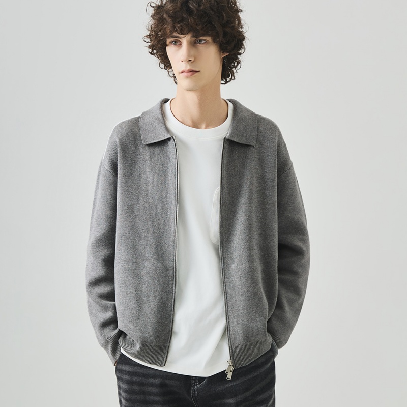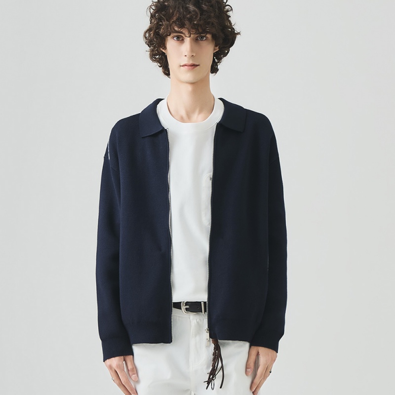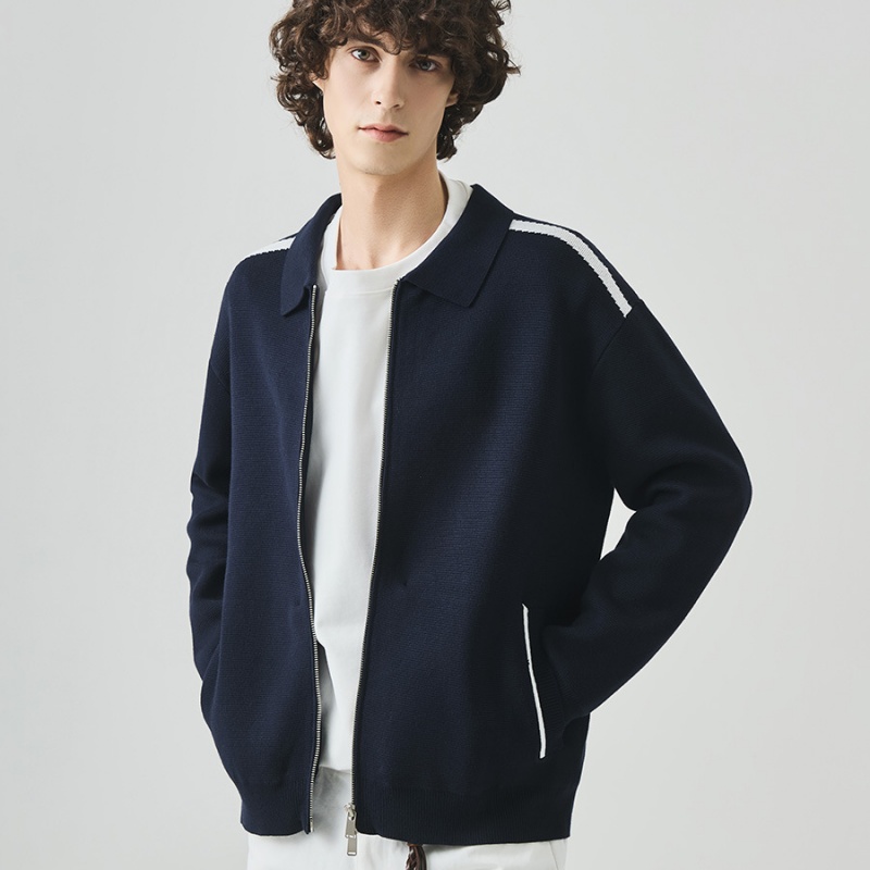 The contrasting zippered cardigan worn by the man in the picture is a lapel sweater. Below is a detailed introduction to this type of lapel sweater: