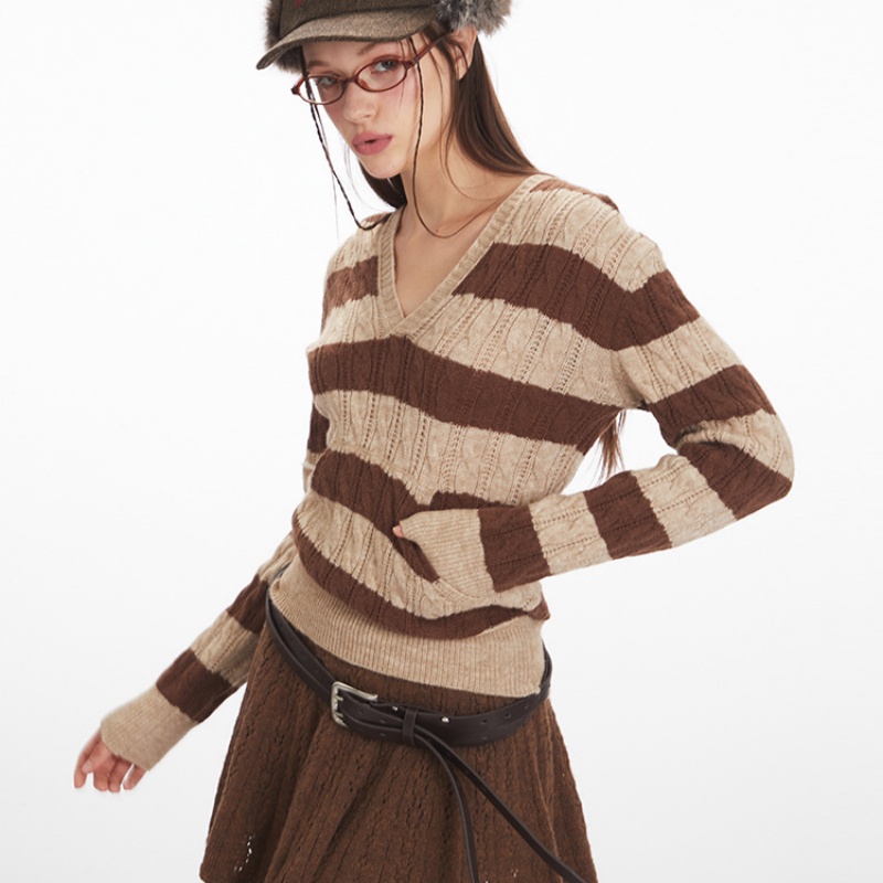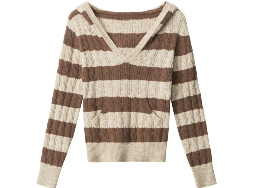 Striping: The contrasting brown and off-white stripes are arranged in a regular pattern, rather than a monotonous, evenly spaced pattern. This irregular arrangement of stripes gives the sweater a stronger visual impact and design, creating a retro yet fashionable style that is instantly recognizable.