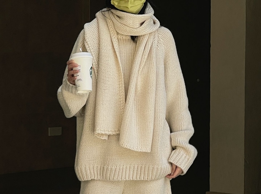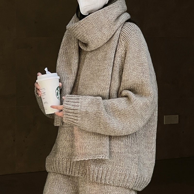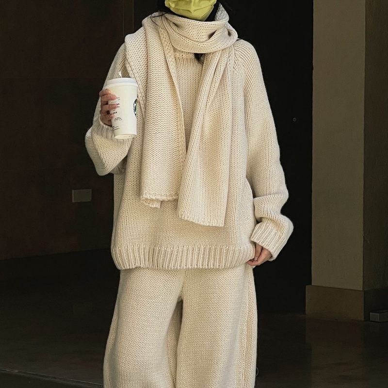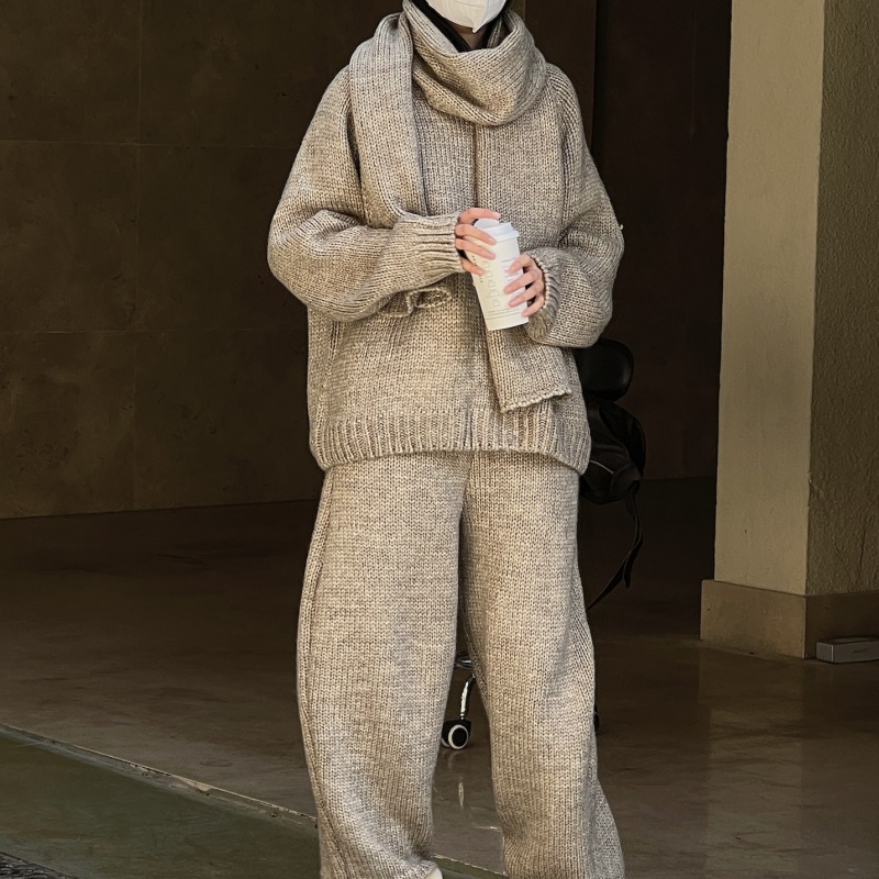 Combining a sweater top, wide-leg knit pants, and a matching scarf, it creates a complete outfit, eliminating the need to overthink the individual pieces and creating a cohesive look.