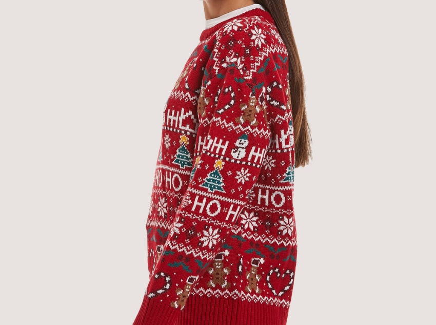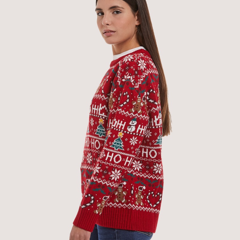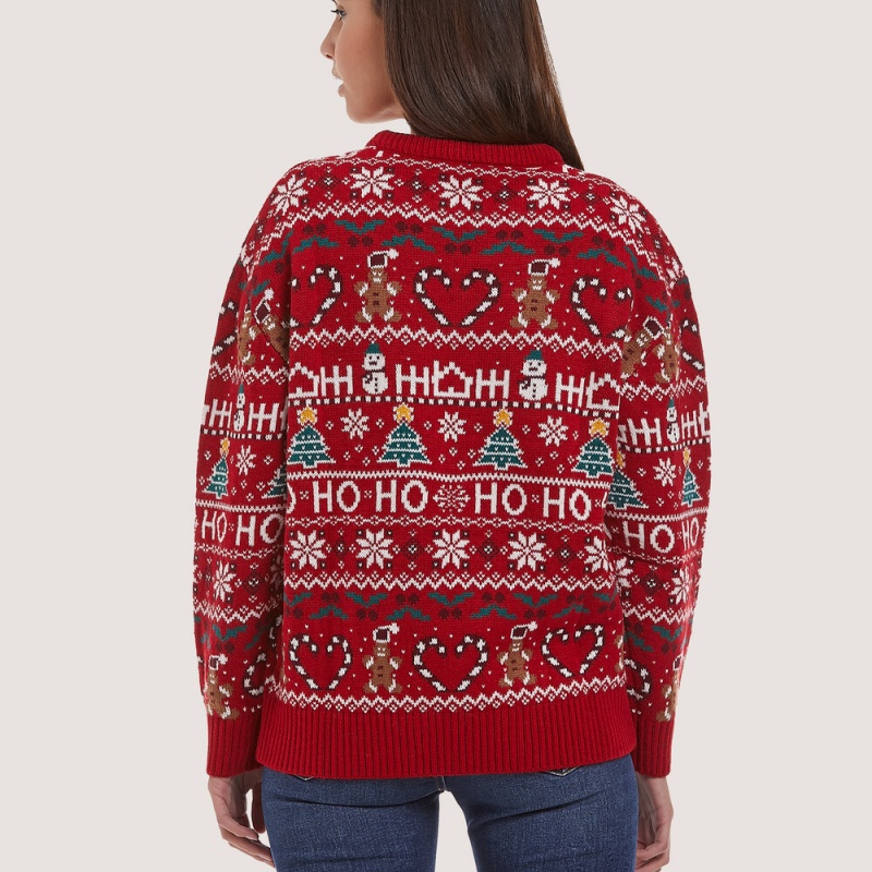 Holiday Elements: The jacquard pattern incorporates various Christmas symbols, such as gingerbread men, Christmas trees, snowflakes, hearts, and theHO HO HOmessage, reinforcing the holiday theme.