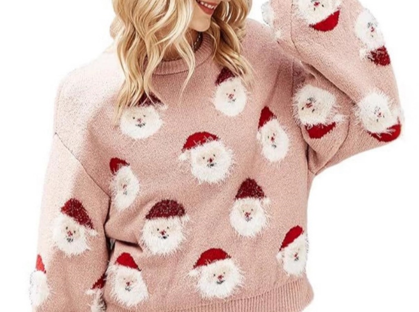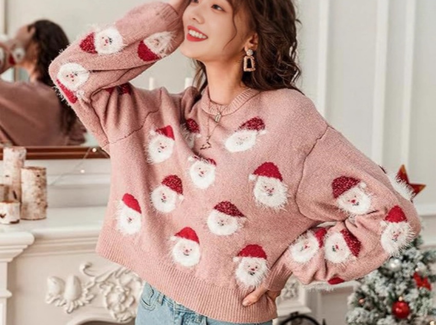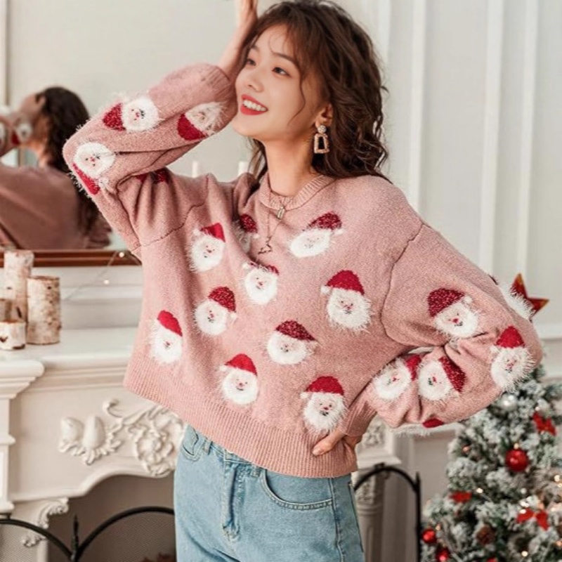 This Christmas women's pullover sweater combines festive atmosphere, comfort, and exquisite craftsmanship. Its distinctive Santa jacquard pattern creates a distinct Christmas style. The blended fabric ensures comfort and warmth, while the exquisite craftsmanship ensures durability. The loose fit and soft color enhance its versatility. Whether worn for Christmas-themed occasions or everyday wear, it creates a unique sense of fashion and festive spirit, making it a must-have this Christmas season fashion item.