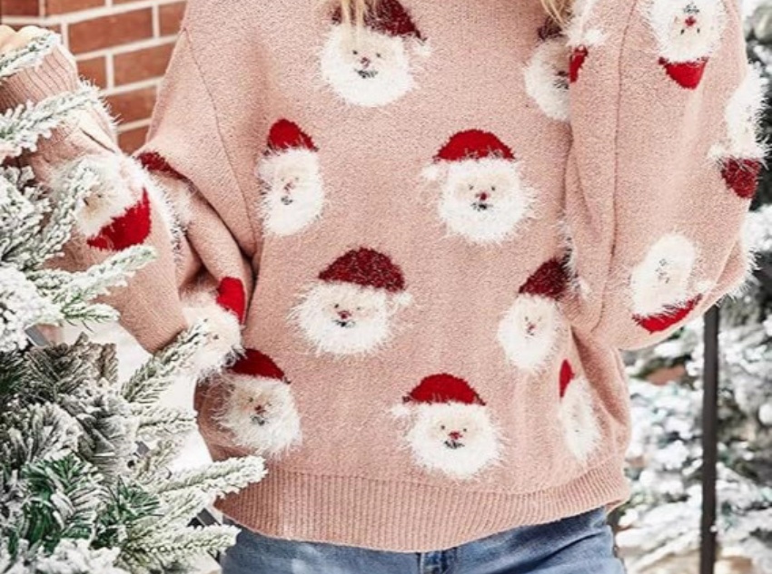 The sweater features a jacquard pattern of Santa Claus’s head, with Santa’s face in white and his hat in red. Some hats are even embellished with sequins, adding a touch of visual sparkle and festive sophistication. The pattern is evenly distributed across the body and sleeves, imbuing the overall design with a playful and festive feel. Each jacquard detail seems to convey Christmas blessings, making the sweater a vivid embodiment of the Christmas theme.
