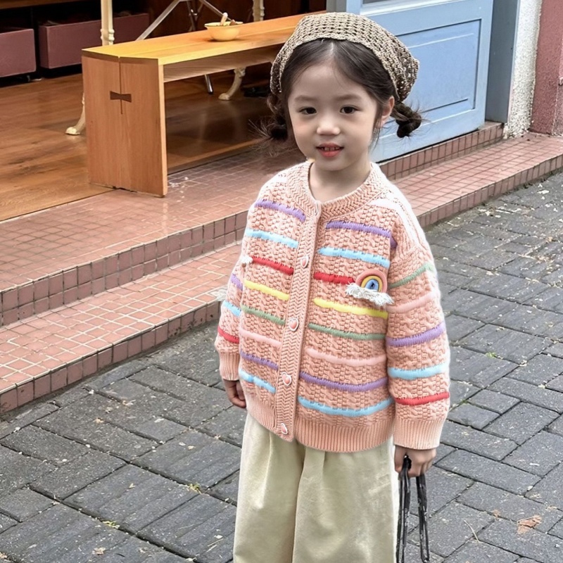 Versatility: The combination of a nude pink and white base with rainbow stripes pairs well with basic colors like beige, khaki, and white bottoms (as shown in the beige wide-leg pants), and can also be paired with skirts or sweatshirts in the same or contrasting colors, offering a wide range of styling possibilities for children.