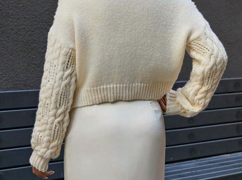Main cable knit texture: Utilizing a chunky knit 3D cable pattern, the texture interweaves in arope-likepattern, with each cable stitch approximately 3-5cm wide, adding to the garment’s three-dimensionality and retro feel.
