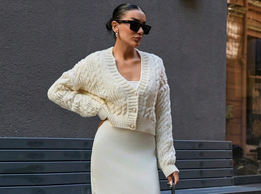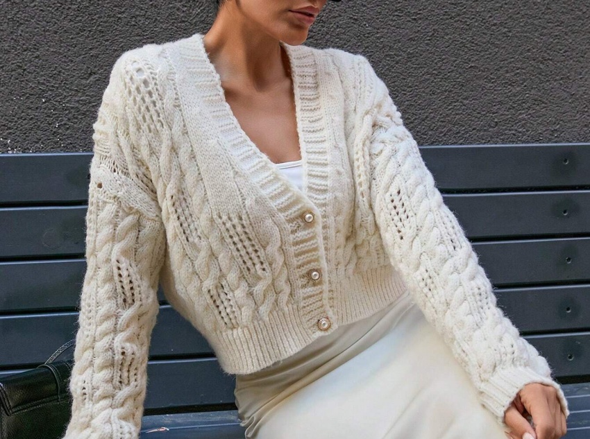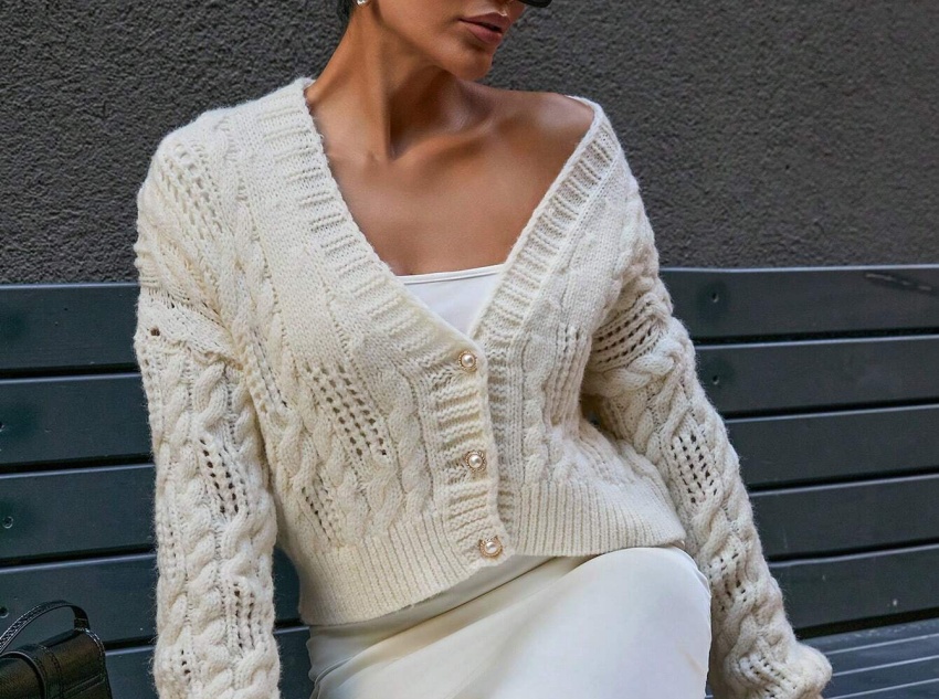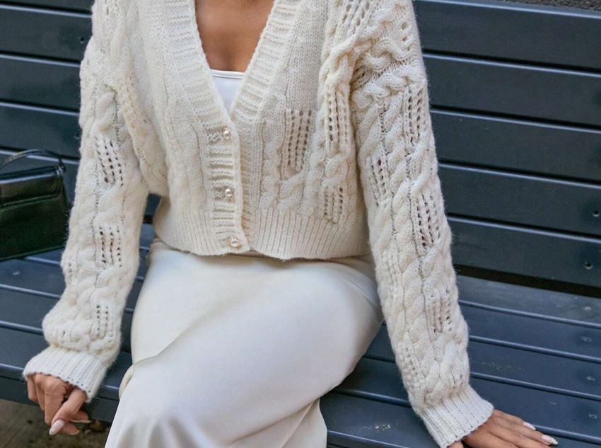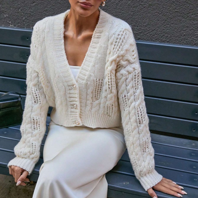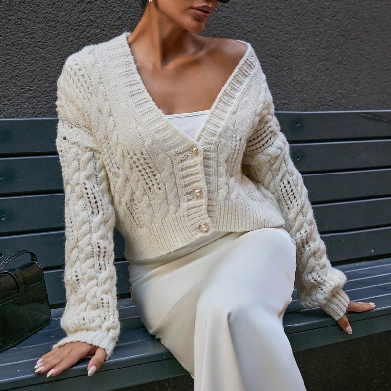 The core advantage of this V-neck cable knit openwork women's sweater is its versatility and balanced texture: In terms of design, the V-neck, cropped length, and pearl buttons soften the heaviness of the knit, while the cable knit and openwork details enhance its retro and sophisticated feel; In terms of fabric, the blended material achieves a balance between warmth and softness; In terms of occasion, it's suitable for both casual everyday wear and formal work attire, making it a highly versatile piece for your autumn/winter wardrobe. Would you like me to help you create a styling guide for this sweater?