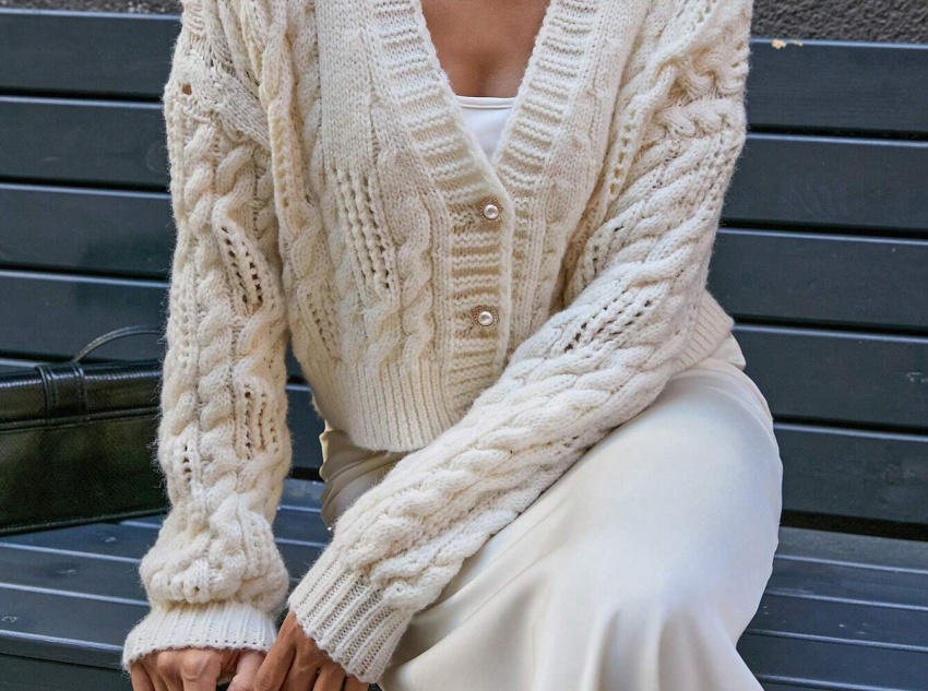 This V-neck cable knit openwork women’s sweater is a stylish piece for autumn and winter, combining a retro feel with a relaxed vibe. From its design to its craftsmanship, it embodies the logic ofgentleness and practicality coexisting.Below is a detailed analysis from multiple perspectives: It features a wide V-neck and pearl button placket: the V-neck depth is controlled at a slight 15° angle, which not only flatters the neckline and makes the face appear smaller but also prevents any wardrobe malfunctions; the round pearl buttons soften the heaviness of the knitwear and add a touch of refined gentleness. The V-neck opening also provides space for layering (it can be layered over camisoles or shirts).
