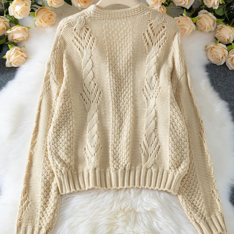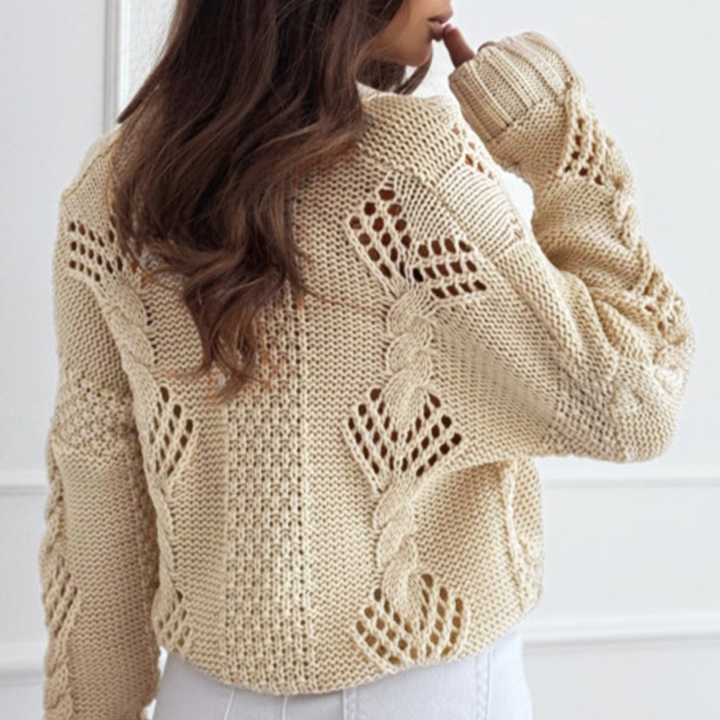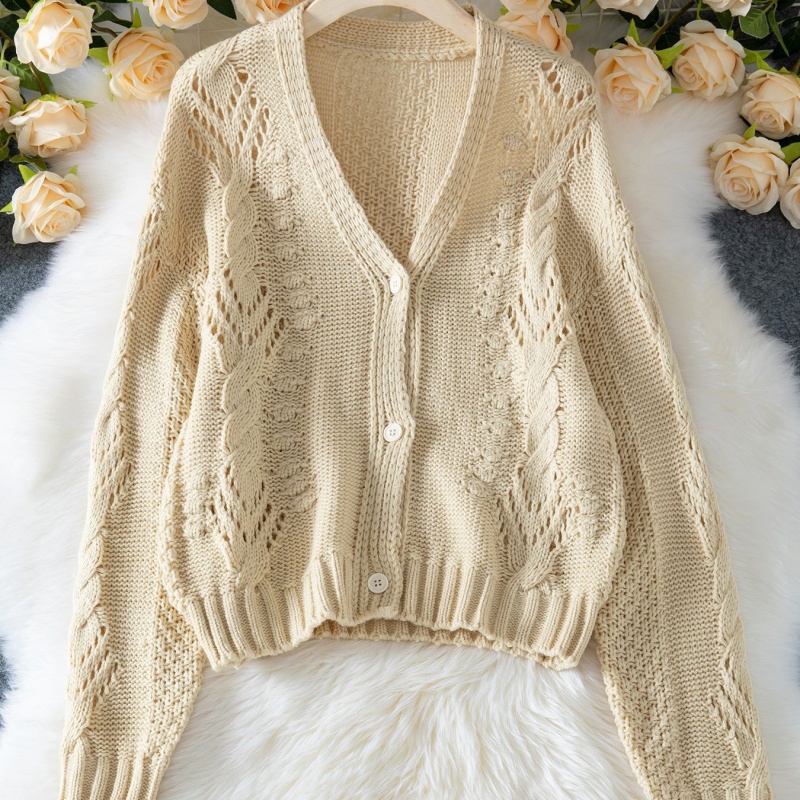 Ganchillo hueco: Principalmente con patrones calados geométricos o florales., La luz se filtra a través de los recortes., creando gradaciones de luz y sombra, dándole al suéter una sensación ligera y aireada, eliminando cualquier embotamiento.