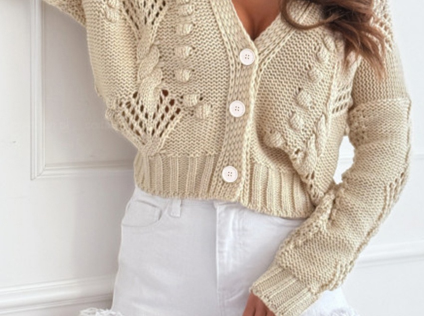Los botones redondos blancos de la tapeta no solo sirven como cierre práctico, sino que también sirven como elemento destacado del diseño., creando un suave contraste con el tono beige y realzando la sofisticación general. Los amplios elementos huecos de crochet en el cuerpo rompen la pesadez tradicional de los suéteres., dando al diseño una sensación más transpirable y moderna.
