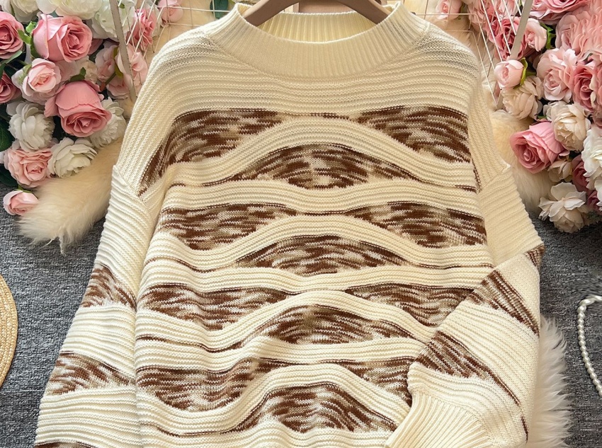 The sweater features a stylish jacquard pattern, primarily featuring wavy stripes in brown and off-white. This pattern breaks up the monotony of a solid-colored sweater, adding visual depth and interest, giving it a stylish and artistic touch. Whether paired with jeans for a casual look or a skirt for an elegant look, this unique jacquard pattern is a sure-fire highlight.