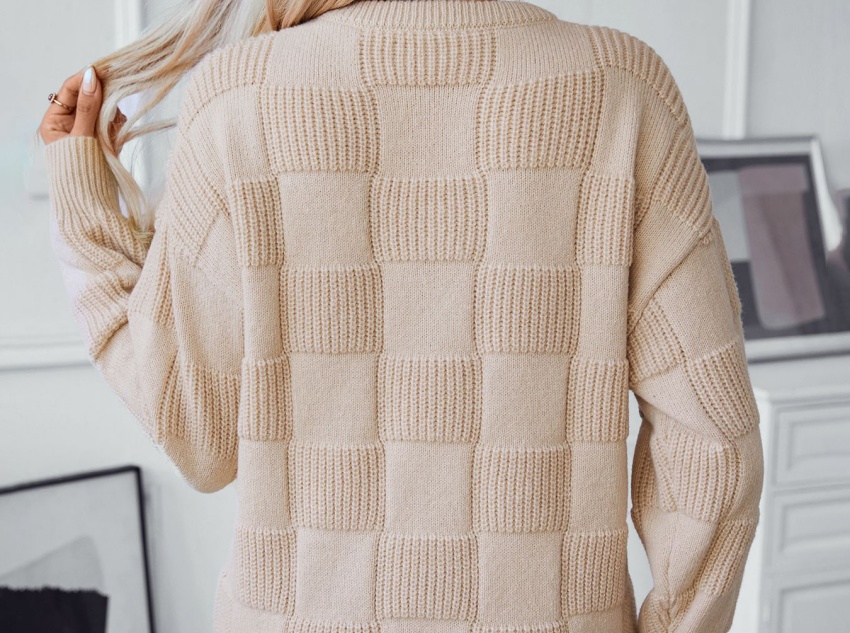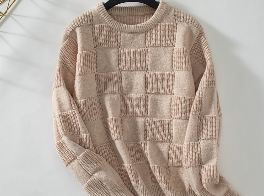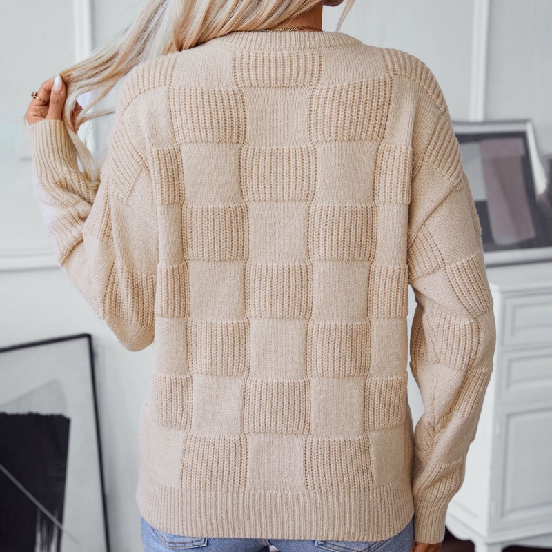 This sweater features a simple round neckline, minimizing the feeling of a restrictive neckline and adapting to various neck shapes and layering needs (such as layering with a shirt or turtleneck). The core design highlight lies in the square check pattern—the combination of squares in different weaves breaks the monotony of traditional solid-color sweaters, adding visual depth and a geometric aesthetic, making this basic piece an instant focal point. המשוחרר, dropped-shoulder silhouette flatters various body shapes while creating a casual, relaxed look, perfect for pairing with jeans, skirts, and other items.