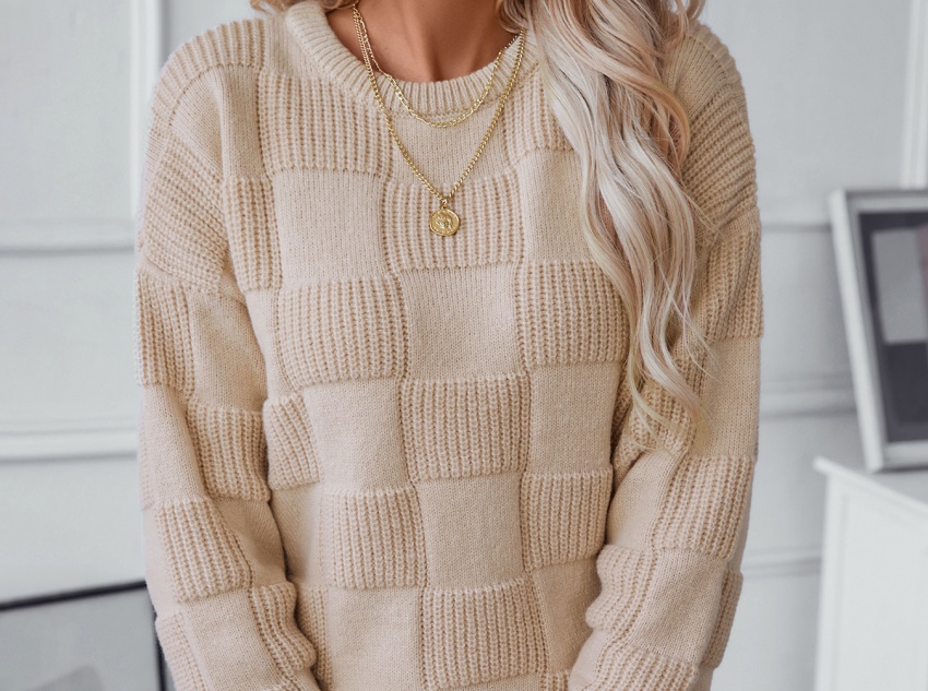 The picture shows an in-depth analysis of the women’s round-neck square check pullover sweater: