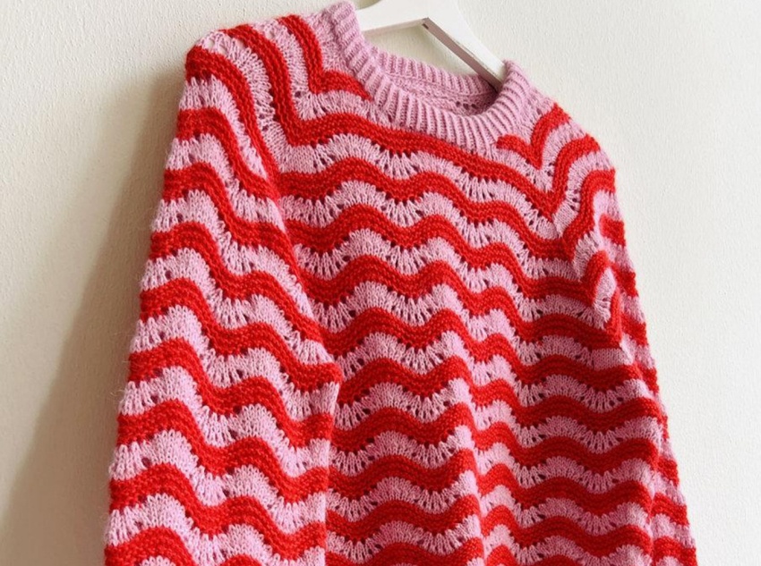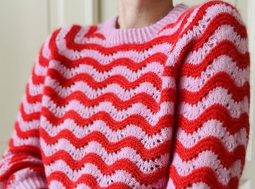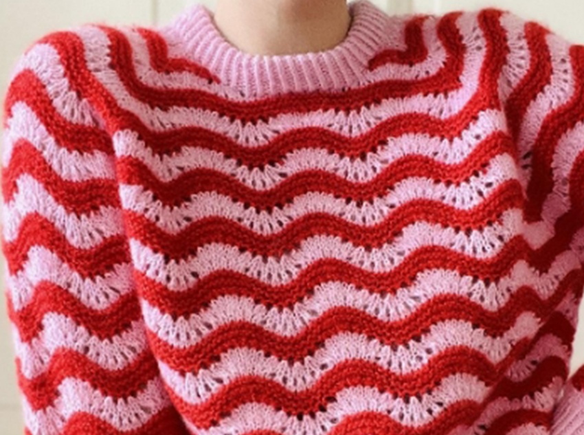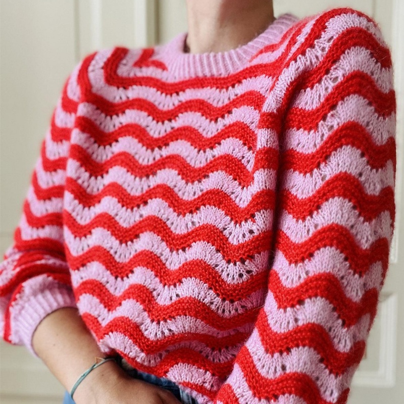 This sweater’s design is instantly recognizable, and the wavy stripes are its core highlight: the red and pink wavy pattern repeats rhythmically across the body, breaking the monotony of the solid color and imbuing it with a lively and romantic visual tension.