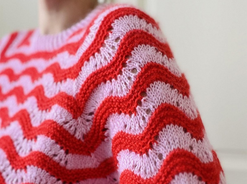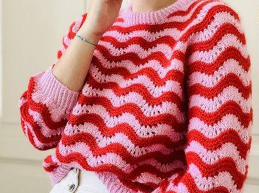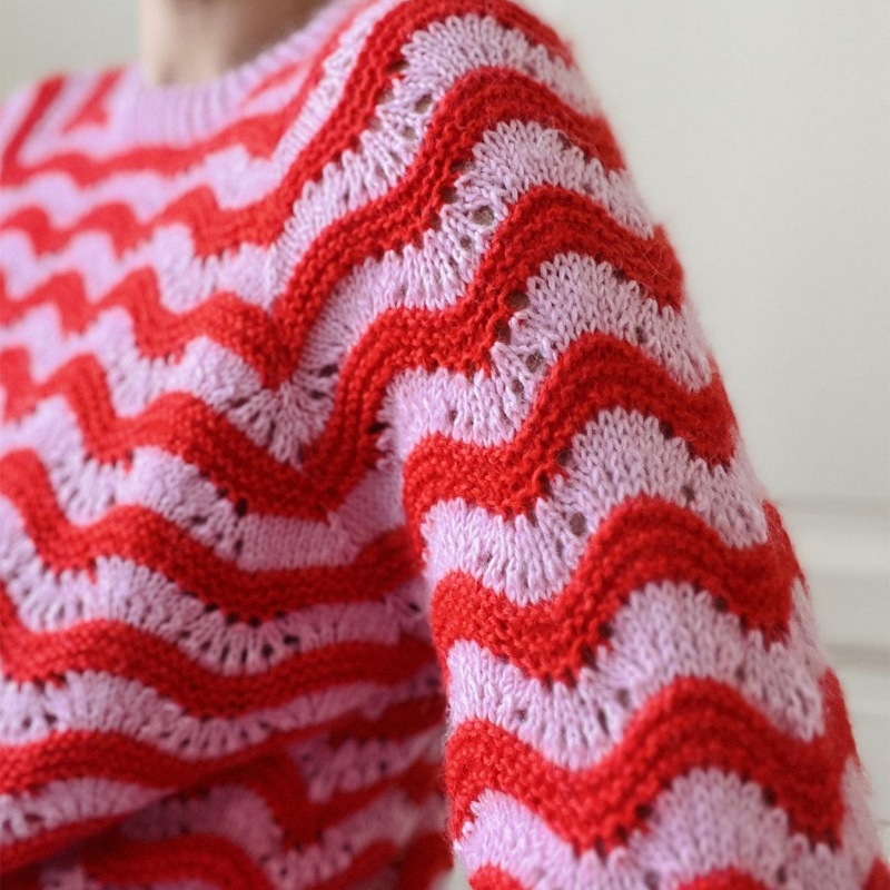 Textured Ridges: The wavy pattern itself is a “dynamic texture,” and the alternating red and pink colors create a visual layering that gives the ribs (the undulating pattern) both decorative and structural qualities. The raised wavy lines enhance the three-dimensional effect of the garment, while the recessed openwork areas add a sense of airiness, creating a texture that transcends monotonous repetition and heavy, three-dimensional massing. This sweater offers a sweet, cool, and casual look, perfect for a variety of occasions:
