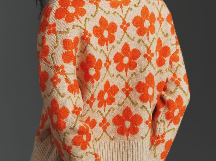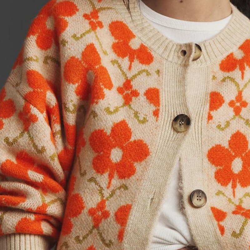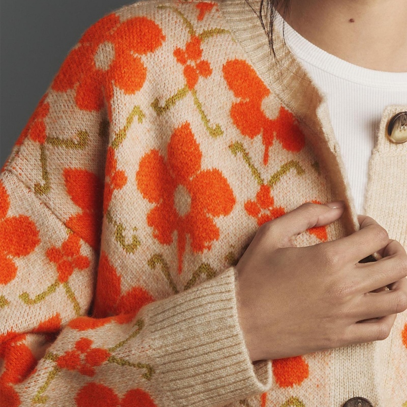 This floral jacquard women’s sweater jacket, pictured, features a retro aesthetic. Its round, cardigan-style neckline softens the feeling of a restrictive neckline, making it suitable for a wide range of layering options, such as a basic white T-shirt or a turtleneck top. The floral jacquard pattern, featuring vibrant orange flowers against an off-white base and olive green outlines, creates a striking visual contrast, creating a vintage yet vibrant look. The metallic buttons at the placket are not only functional but also a finishing touch, adding a refined touch. The short, loose fit enhances the figure, accentuating the waistline and adding a layered feel.