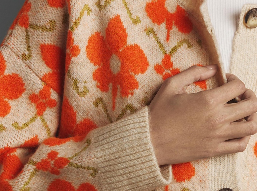 This floral jacquard women’s sweater jacket, pictured, features a retro aesthetic. Its round, cardigan-style neckline softens the feeling of a restrictive neckline, making it suitable for a wide range of layering options, such as a basic white T-shirt or a turtleneck top. The floral jacquard pattern, featuring vibrant orange flowers against an off-white base and olive green outlines, creates a striking visual contrast, creating a vintage yet vibrant look. The metallic buttons at the placket are not only functional but also a finishing touch, adding a refined touch. The short, loose fit enhances the figure, accentuating the waistline and adding a layered feel.