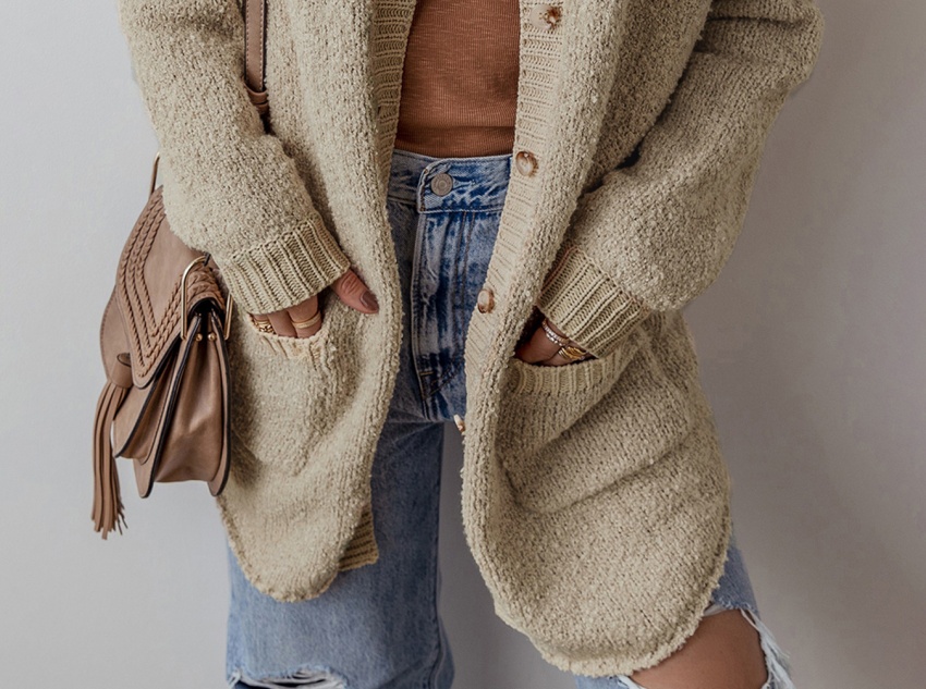 Chunky knit fabric: The yarn is coarser, resulting in a distinct texture after knitting. It offers a balance of breathability and warmth, and has a retro and casual style, perfect for American retro or workwear looks.