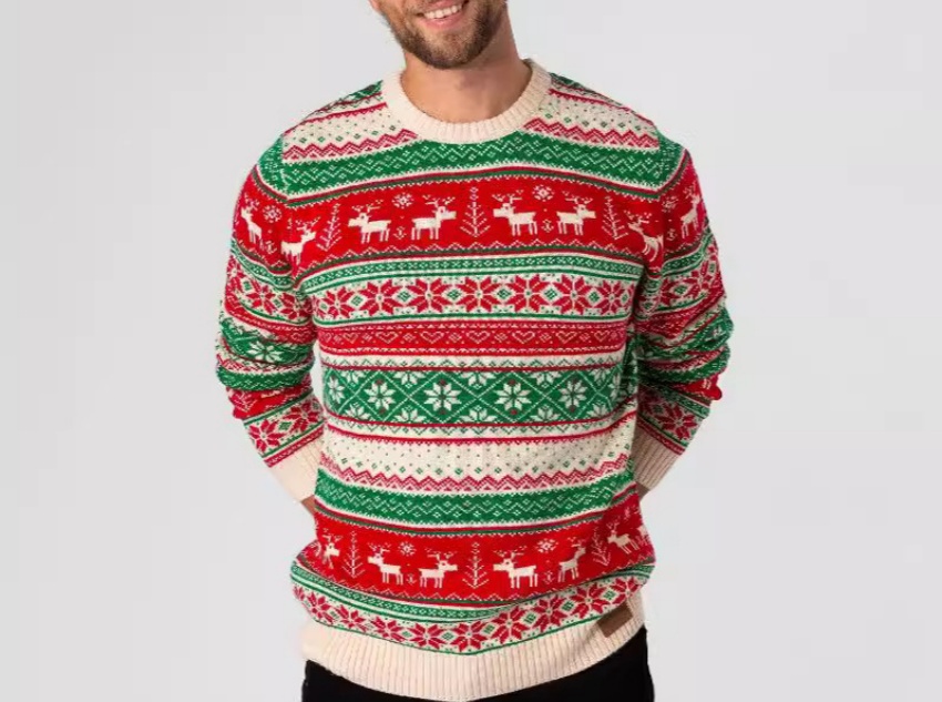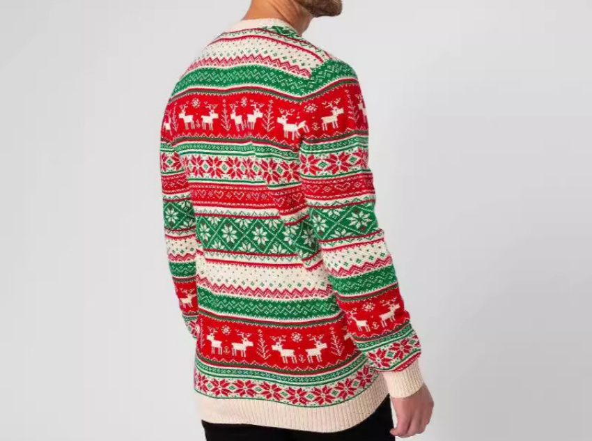 장인 정신 측면에서, 전체적인 자카드 패턴이 핵심 포인트입니다.. 이 기술은 뜨개질 과정에서 서로 다른 색상의 실을 섞어 미리 디자인된 패턴을 만들어냅니다.. 기존의 인쇄물과는 다르게, 자카드 패턴이 직물에 직접 짜여져 있습니다., 강력한 입체 효과를 만들어 내는, 퇴색을 방지하는 명확한 패턴, 장기간의 마모와 마찰에도 무결성을 유지합니다.. 질감이 풍부하고 다양해요, 패턴과 베이스 컬러의 자연스러운 전환을 위해 정밀한 편직 기법을 사용. 각 패턴의 직조에는 정확한 땀수 조절과 실 전환이 필요합니다, 장인정신의 복잡성과 정교함을 보여줍니다., 세심한 장인정신을 강조하다. 자카드 패턴이 주요 시각적 질감을 형성합니다., 엘크 실루엣으로, 눈송이 모양, 기하학적인 선들이 엮여 리드미컬한 시각적 효과를 만들어 냅니다.. 이러한 텍스처는 단일 패턴으로 반복되지 않습니다., 오히려 다양한 색상 블록에 걸쳐 체계적인 패턴으로 분포됩니다., 규칙성과 변화성을 동시에 창출, 스웨터 표면에 깊이감을 더하다. 뿐만 아니라, 스웨터의 골지 패턴 (은은한 골지 구조를 활용해 자카드 패턴을 더욱 돋보이게 한다면) 원단의 입체감과 견고함을 더욱 높여줍니다., 스웨터를 전체적으로 더 스타일리쉬하게 만들어주는. 또한 모양을 유지하고 처짐을 방지하는 데 도움이 됩니다., 전체적인 질감과 착용감을 향상시킵니다..