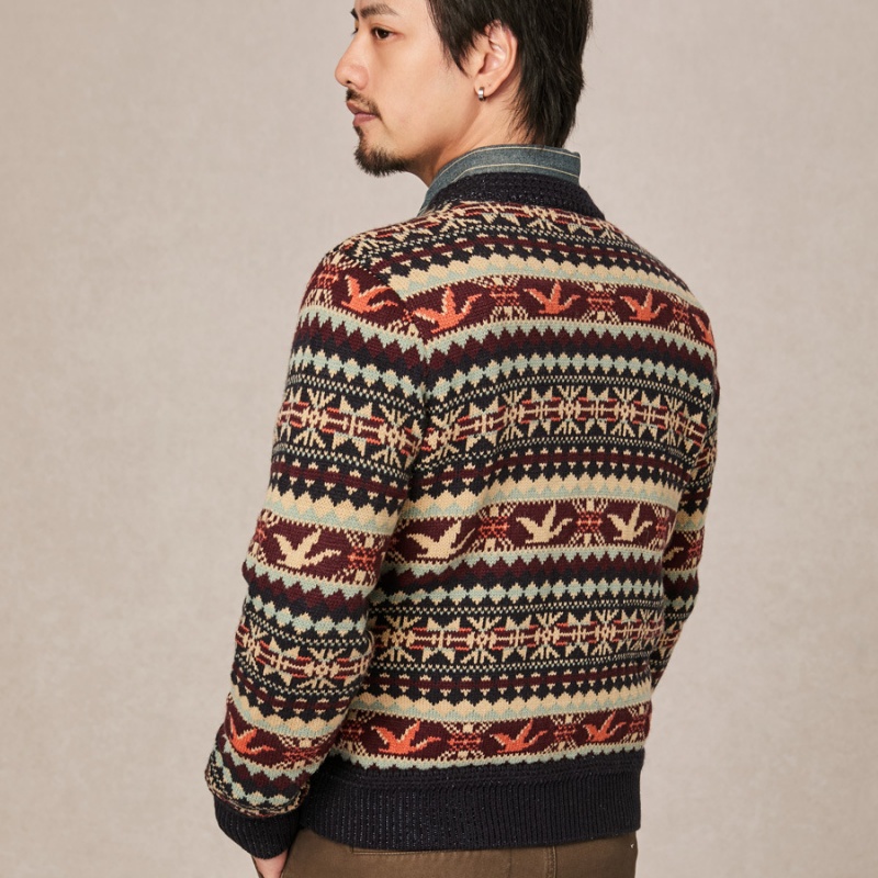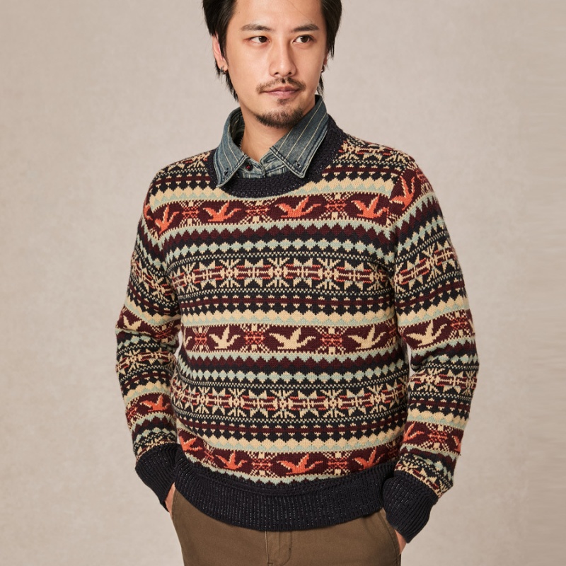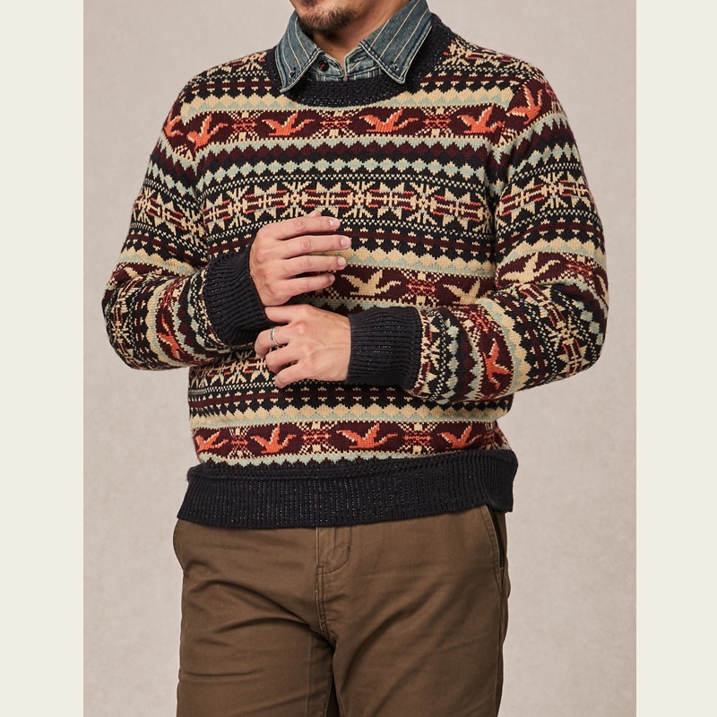 The Fair Isle crew-neck jacquard men’s sweater pictured here boasts a distinctive and unique style.