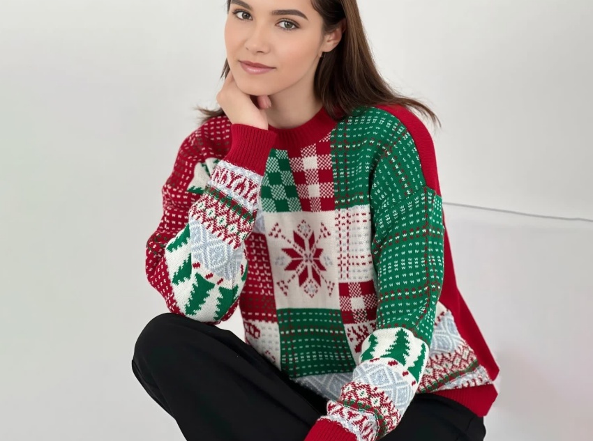 This sweater uses a multi-color jacquard technique, creating patterns on the fabric surface through different colored yarns. The jacquard pattern includes classic Christmas elements such as Christmas trees, snowflakes, reindeer, and plaid, distributed in different color-blocked areas, creating distinct layers and exquisite details.