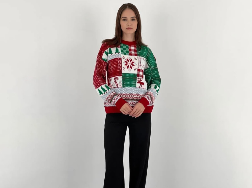 This sweater uses a multi-color jacquard technique, creating patterns on the fabric surface through different colored yarns. The jacquard pattern includes classic Christmas elements such as Christmas trees, snowflakes, reindeer, and plaid, distributed in different color-blocked areas, creating distinct layers and exquisite details.