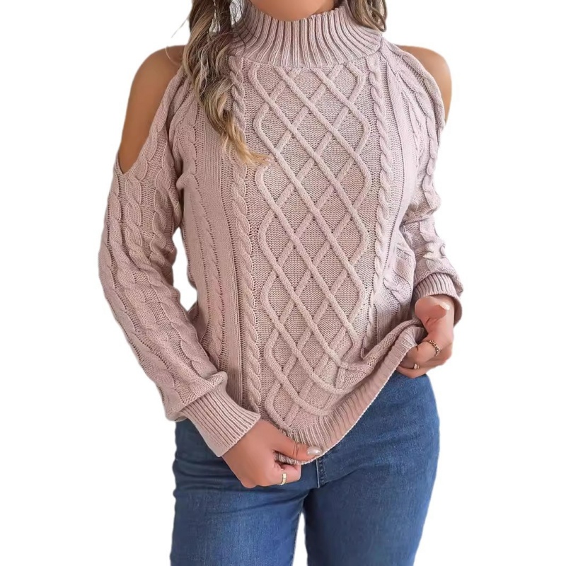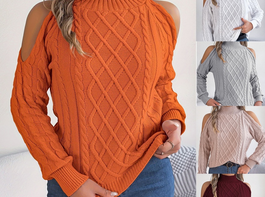 The picture shows a cable-knit off-the-shoulder, half-turtleneck, long-sleeved pullover sweater for women. An in-depth analysis:
