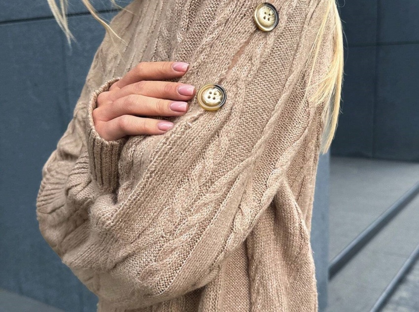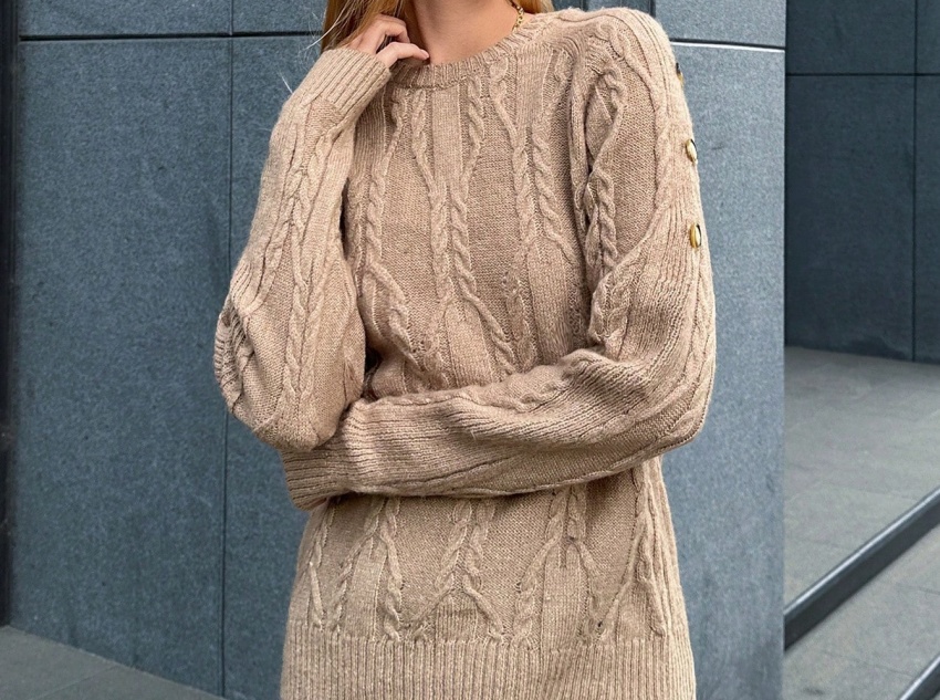 The back features a button-down openwork design—metallic buttons connect the openwork areas, preserving the integrity of the cable knit pattern while breaking up the heaviness with exposed skin, adding a touch of feminine subtlety. The buttons also serve as visual embellishments, enhancing the overall sophistication.