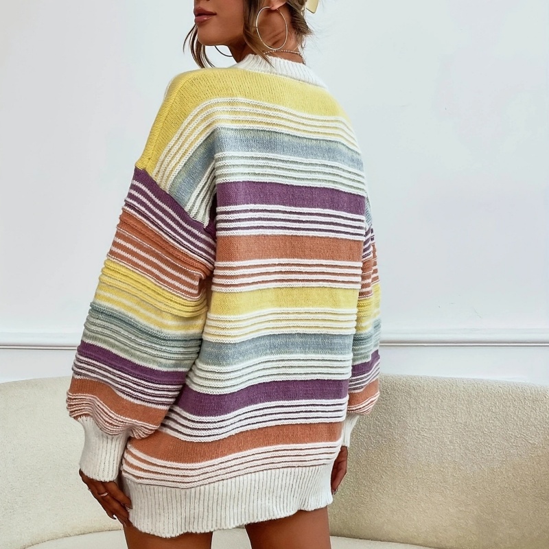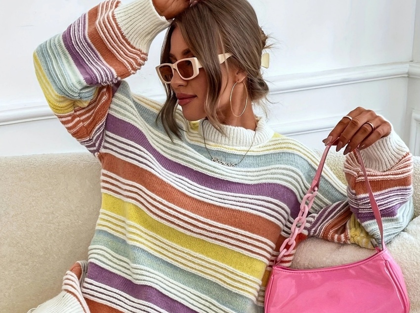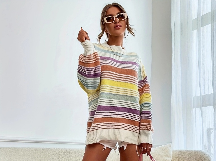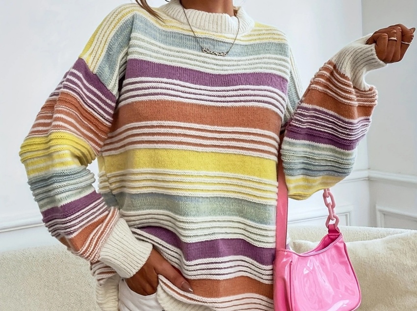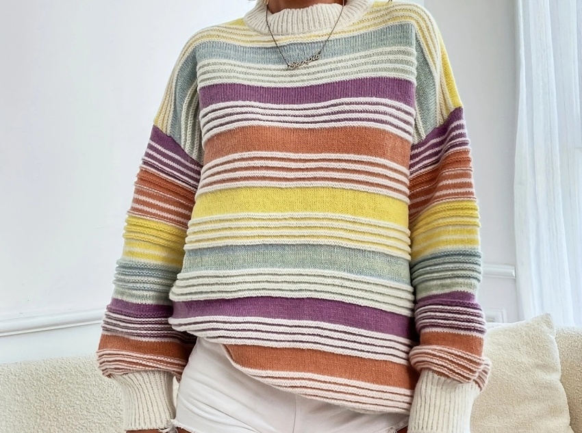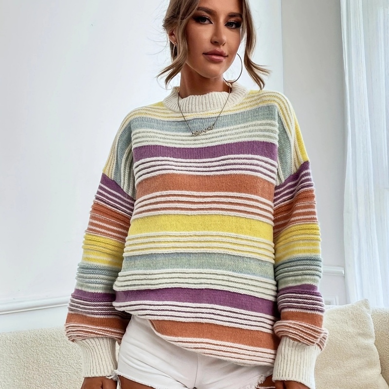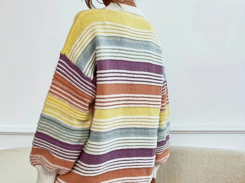 The sweater’s texture is based on a plain weave, combined with the vertical extension of the stripes to create a rhythmic visual texture. While there is no obvious ribbed design, variations in the width and arrangement of different colored stripes create a layered effect similar to ribbed patterns, giving the sweater a stylish yet simple design.