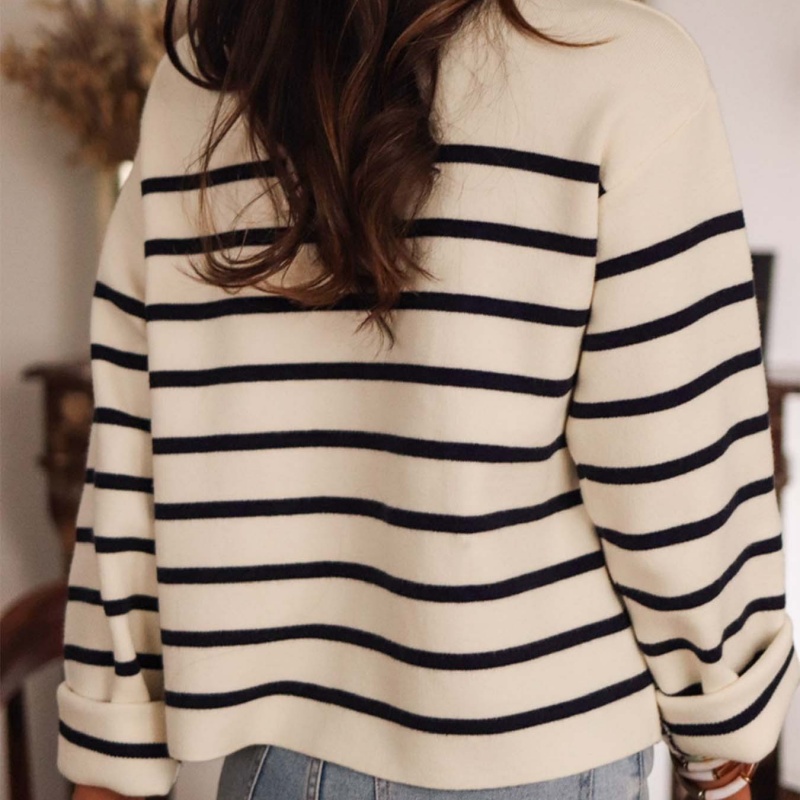Полосы: Классическая кремово-белая основа в сочетании с широкими темно-синими полосами сохраняет винтажный вид бретонского свитера, создавая при этом свежий вид., чистый вид благодаря цветовому контрасту, легко адаптируется к любому тону и стилю кожи.