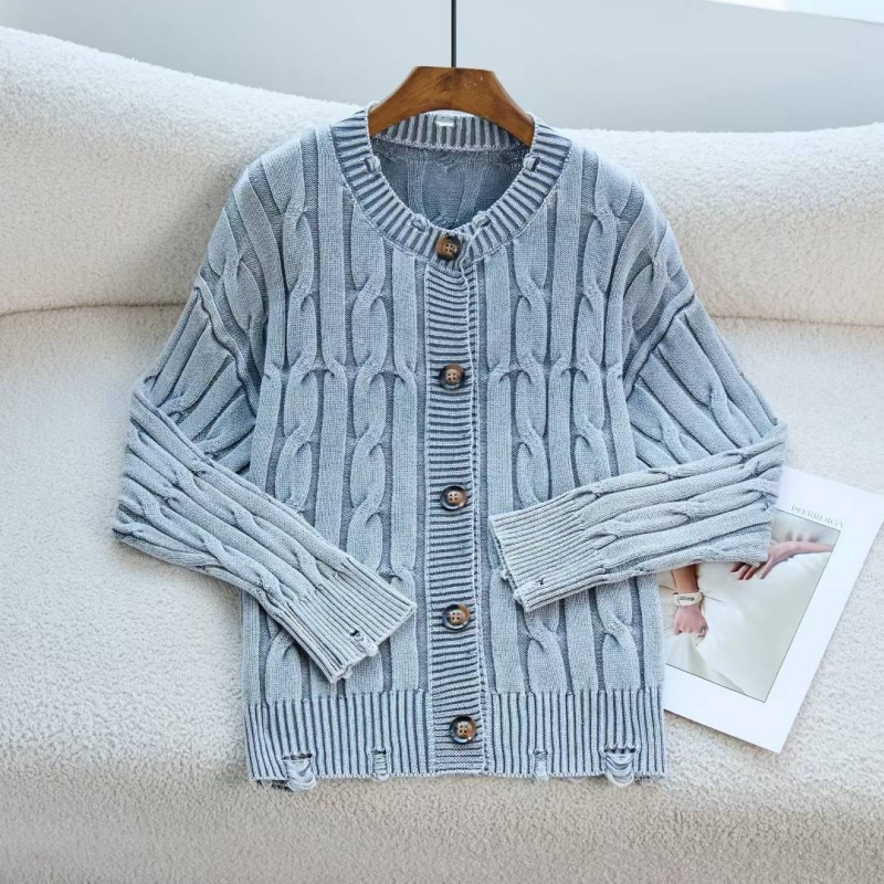 This sweater is made of a blended fabric, combining the softness and warmth of wool or cashmere with the durability and easy care of synthetic fibers. The wool component provides a comfortable feel against the skin and excellent warmth, keeping the wearer warm and cozy in autumn and winter; the synthetic fiber component enhances the fabric’s wrinkle resistance and durability, reducing pilling and deformation issues during daily wear, while also allowing the distressed and ripped details to maintain their shape for longer. The overall fabric is soft to the touch and has a slightly fluffy feel, providing warmth without feeling heavy or constricting.