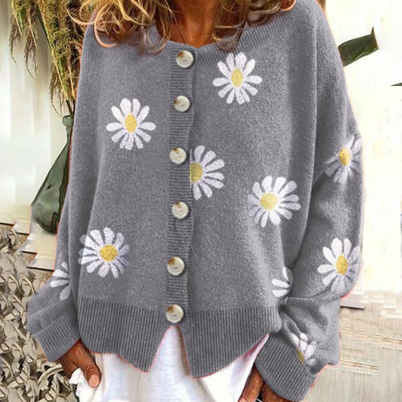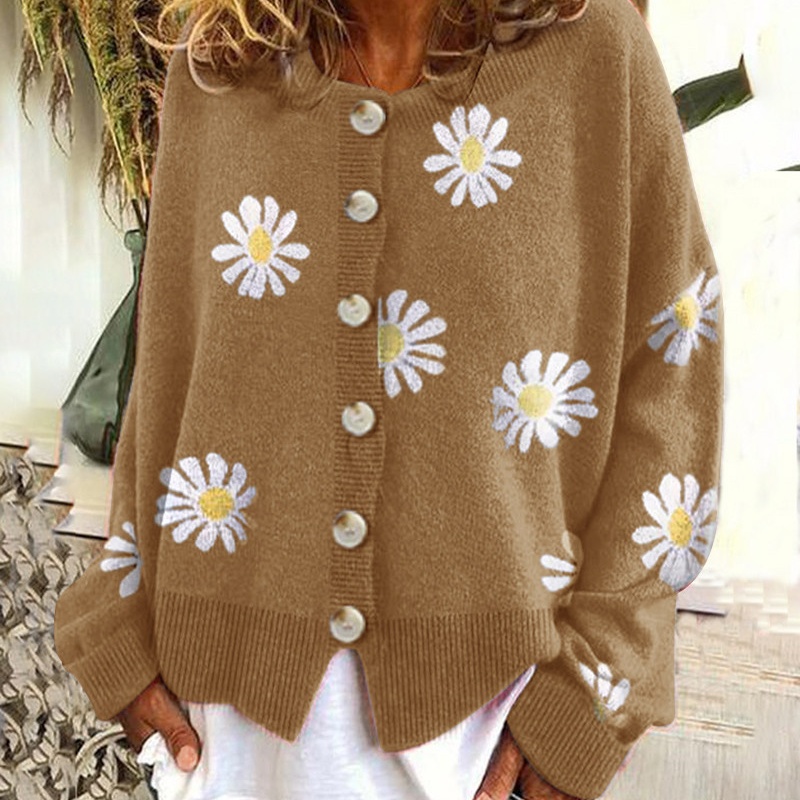 The key highlight is the daisy embroidery pattern: the flowers are scattered across the body and cuffs, avoiding the clutter of an all-over print and instead creating a subtle, delightful surprise. The petals are embroidered with white thread and yellow stamens, the colors soft and harmonious, brightening the overall tone while retaining the gentle atmosphere of autumn.