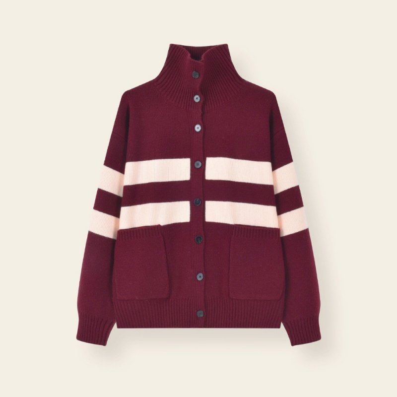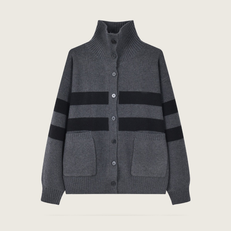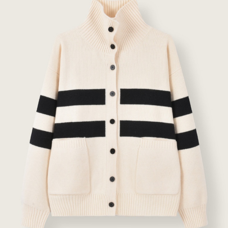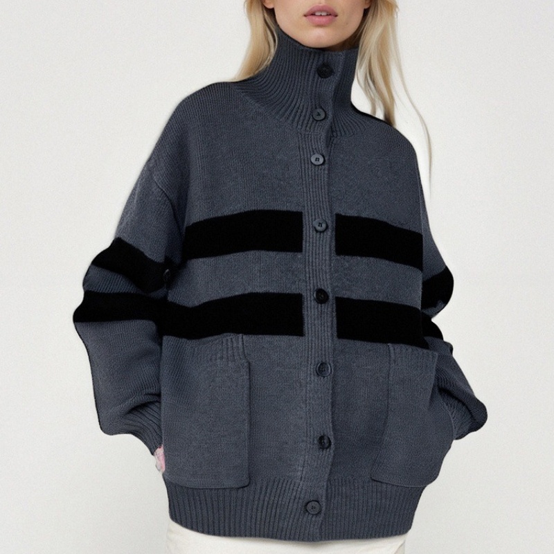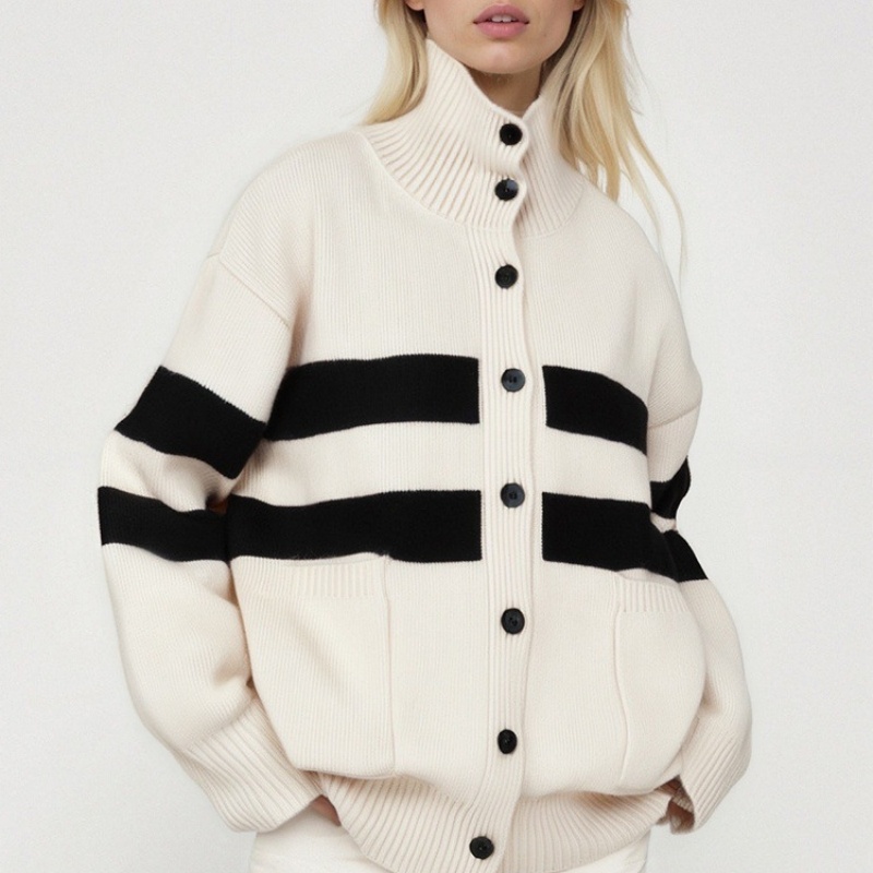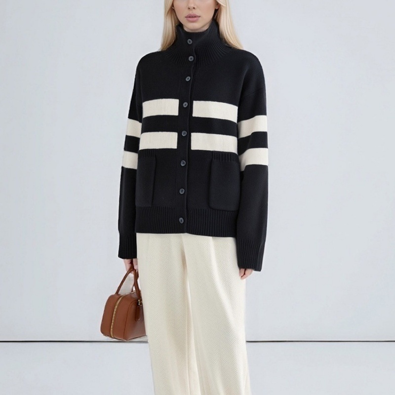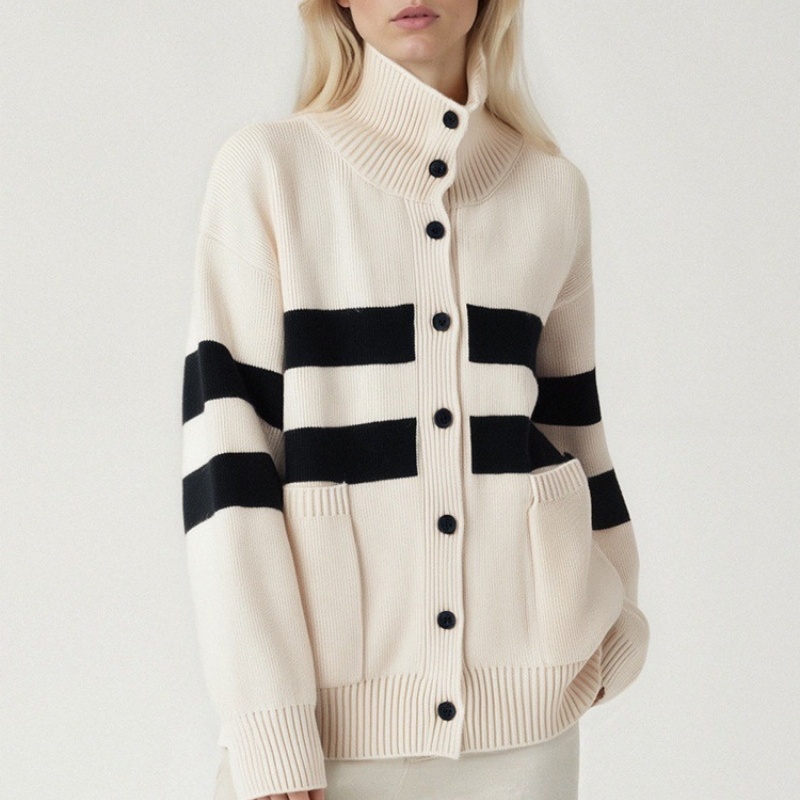 In-depth analysis of the high-neck striped women’s cardigan sweater pictured.