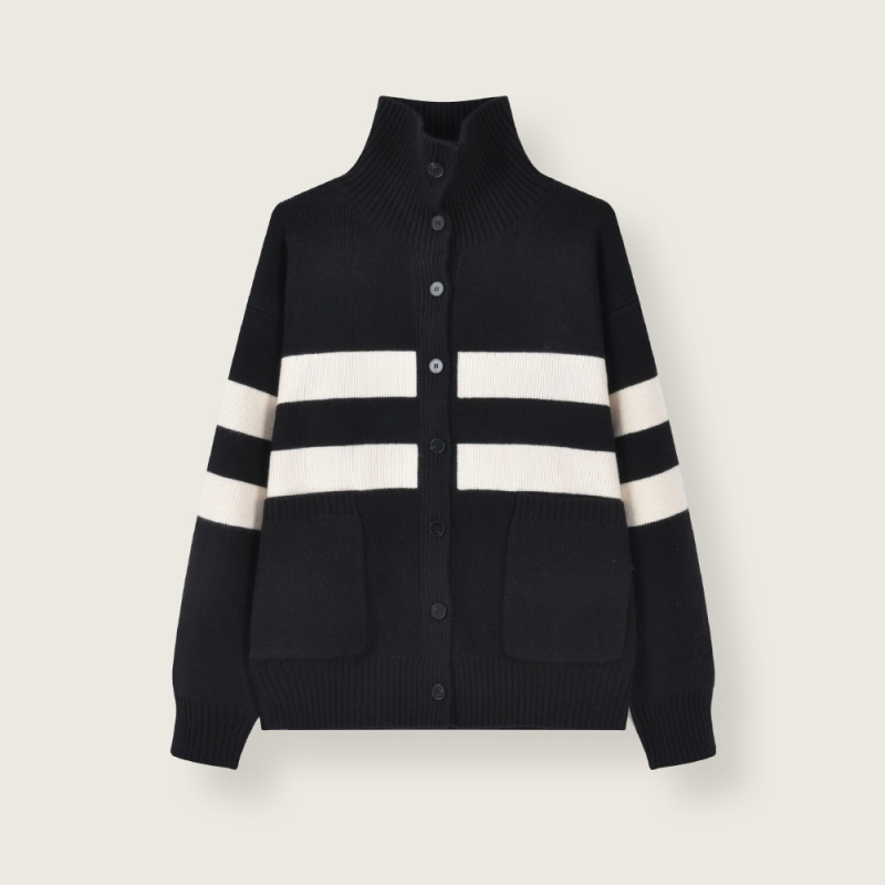 This high-neck striped women's cardigan sweater perfectly blends classic style with modernity, comfort and style. Its oversized turtleneck and contrasting black and white stripes give it a striking, fashionable look that easily adapts to a variety of styles. The premium wool blend (or knitted cotton blend) ensures comfort and warmth. The exquisite stitching, button fastening, and ribbed knitting highlight its quality and durability. Whether worn daily or for work, it's a versatile piece worth investing in for the fall and winter wardrobe, perfect for women who appreciate both style and comfort.