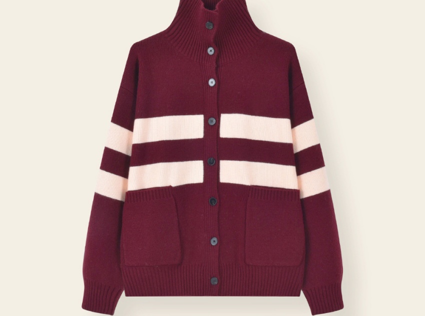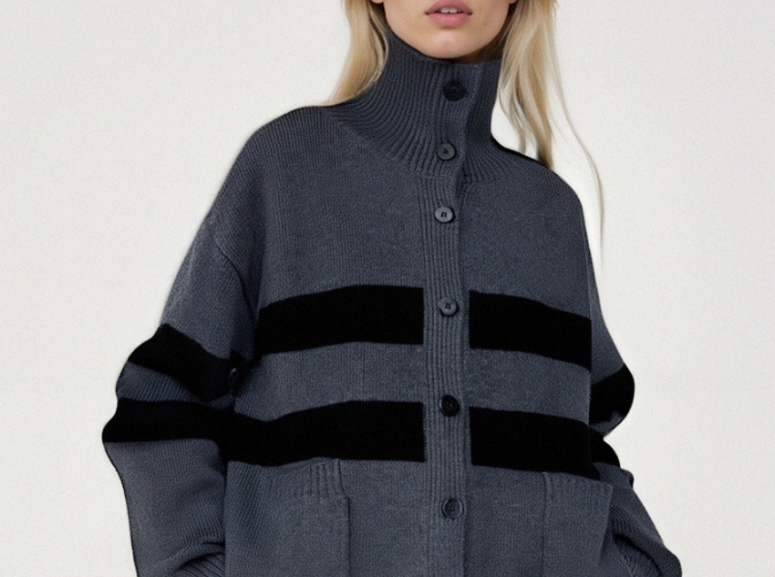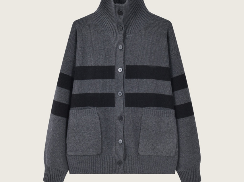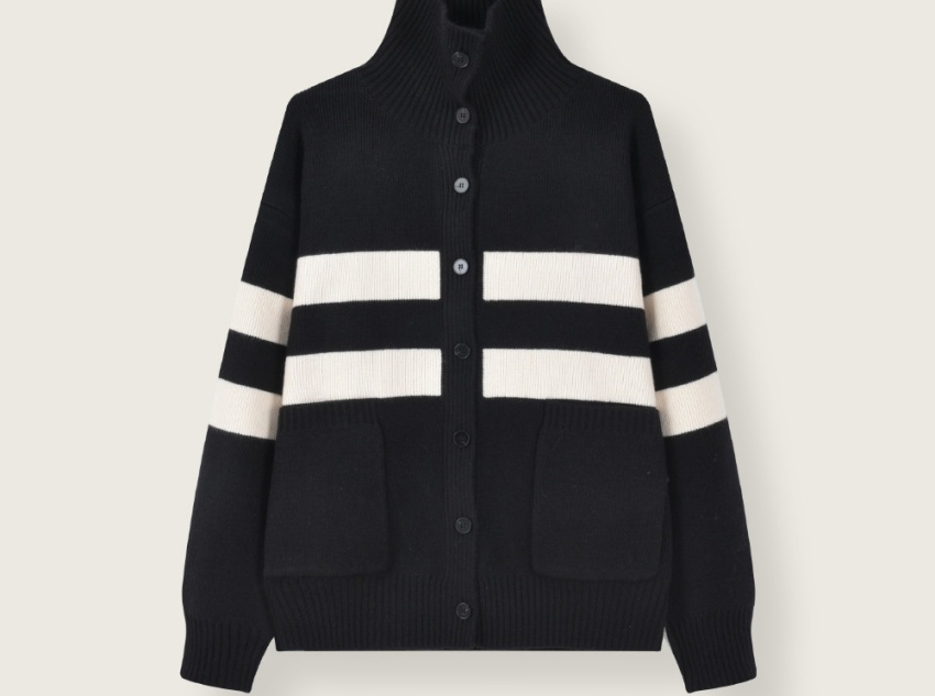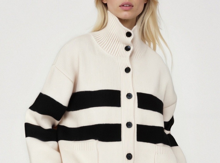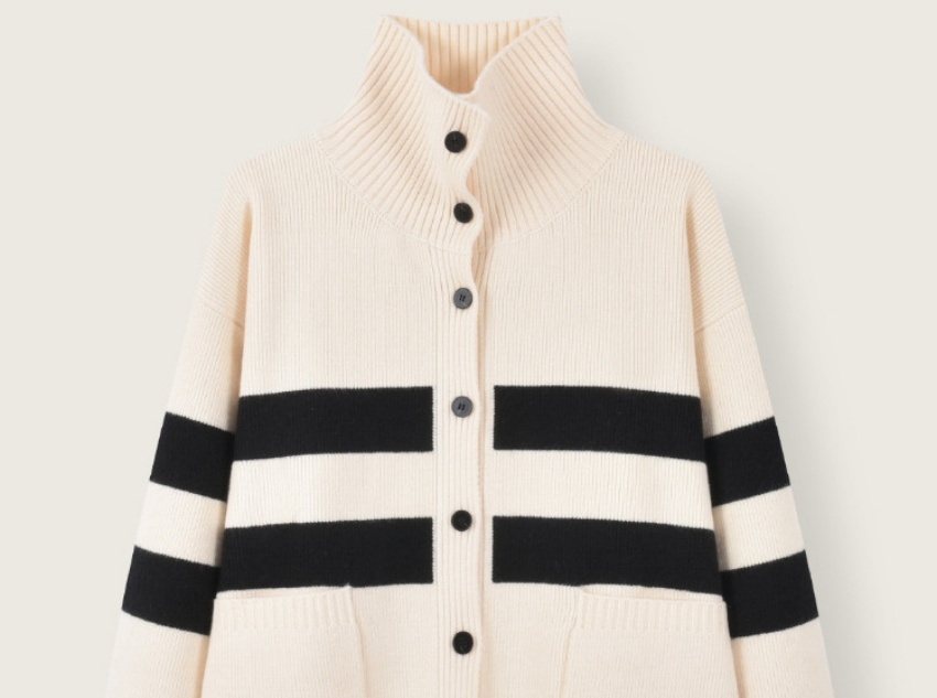 In-depth analysis of the high-neck striped women’s cardigan sweater pictured.