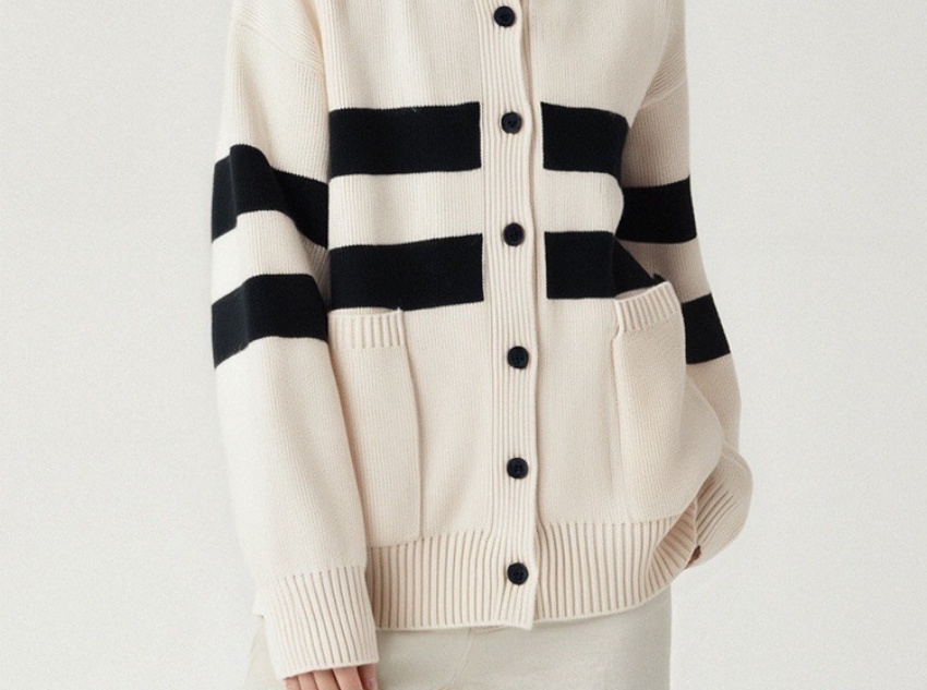 Details: The placket is embellished with a row of black buttons, echoing the black and white stripes, creating both practicality and decorative appeal. Large pockets on each side not only add functionality (for storing small items) but also visually balance the fit and add a layered feel to the overall design. The contrasting black and white stripes are a design highlight, a timeless classic color combination. The uniform width of the stripes creates a simple and elegant visual effect.