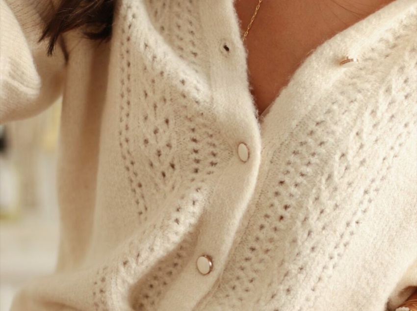 Jointing and seaming: The seams and stitching throughout the garment are meticulously crafted, with even and smooth stitching, demonstrating high-quality craftsmanship and ensuring the garment’s durability. This cardigan features an openwork knit texture with a regular geometric pattern, creating a light and artistic feel. Unlike traditional ribbed stripes (mostly vertical or horizontal convex and concave stripes), this cardigan’s contrasting hollows create a unique visual dimension, transforming the sweater from a plain knit into a stylish statement piece with a design twist.