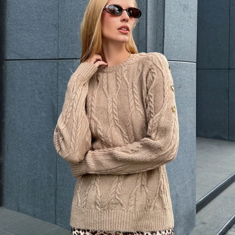 This cable-knit sweater with openwork shoulders is a retro-inspired knitwear piece perfect for autumn and winter, embodying the current trend of relaxed style in its design, craftsmanship, and wearing experience. Here’s a detailed breakdown: