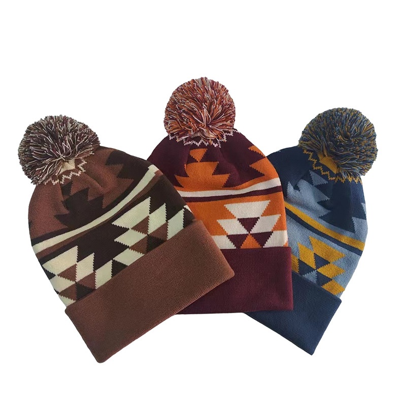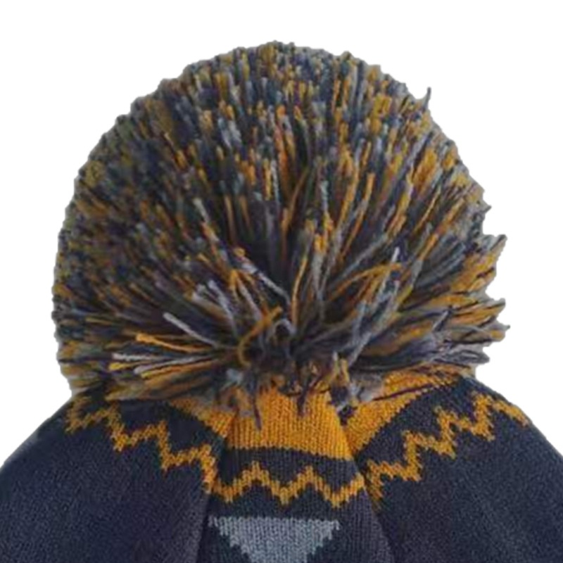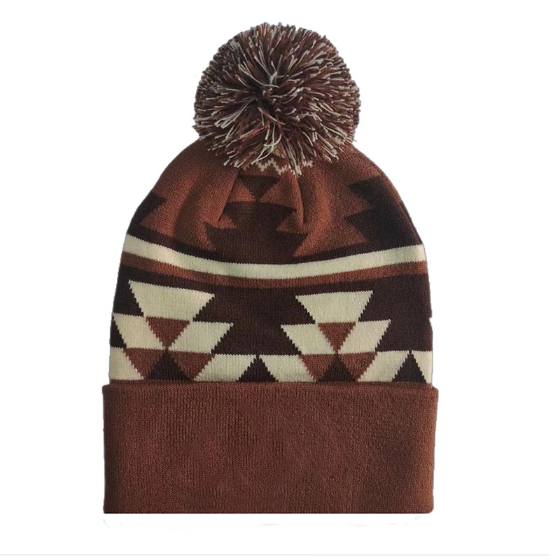There is a hairball on the top of the hat. The hairball is large and fluffy, and the material looks soft and smooth. The existence of hairballs breaks the sense of regularity brought by geometric patterns, adds a hint of lively and playful atmosphere, makes the whole hat more flexible, and also improves the overall fashion.