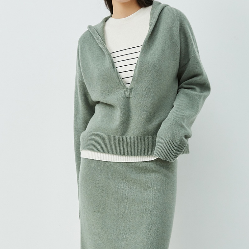Pictured here is a women's sweater hooded suit, with the hooded cardigan being one of the highlights of the look. It uses a loose V-neck version of the design, the cuff uses a ribbed design to play a role in the opening, to prevent cold air in, the skirt uses a straight tube version, the bottom is a knitted skirt of the same color, and the top in the material and tone of each other.