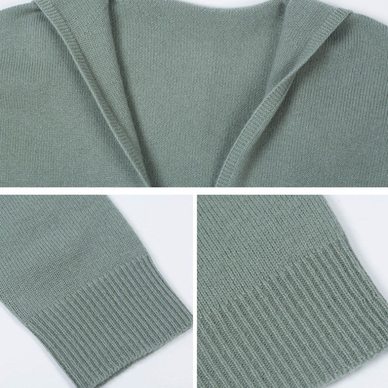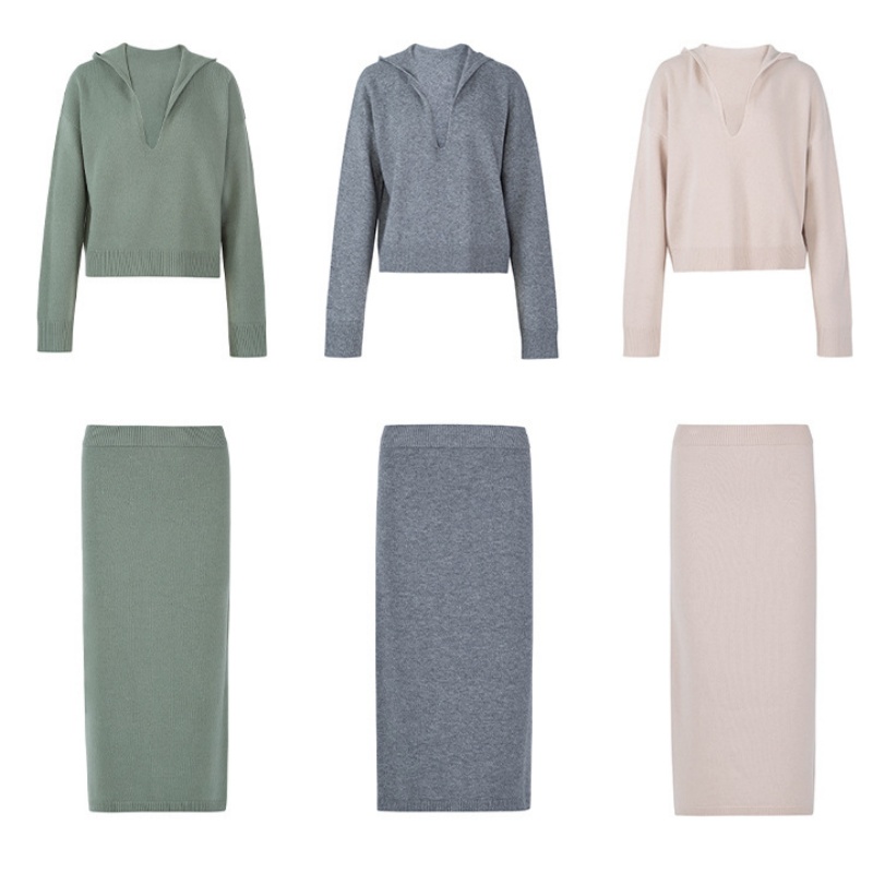 The color of this set of wear choose soft green, giving a fresh and natural, gentle and quiet feeling, suitable for spring and autumn season wear. At the same time, from the multi-color matching diagram provided, it can be seen that this hooded cardigan and skirt also have a variety of color choices such as gray and beige. Grey low-key calm, suitable for the pursuit of simple atmosphere style of people;