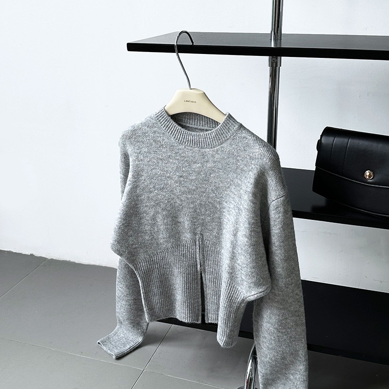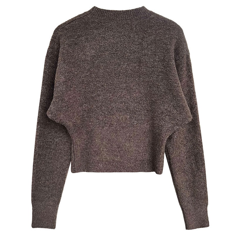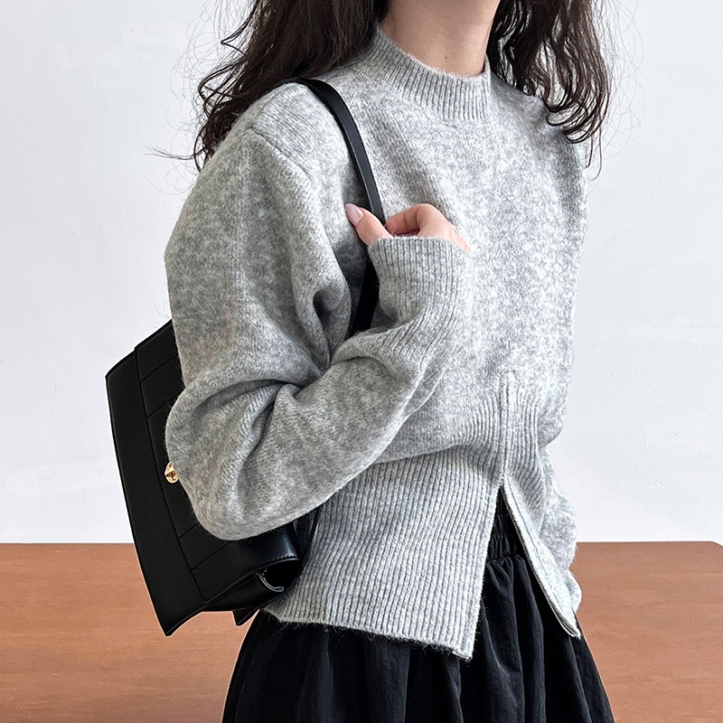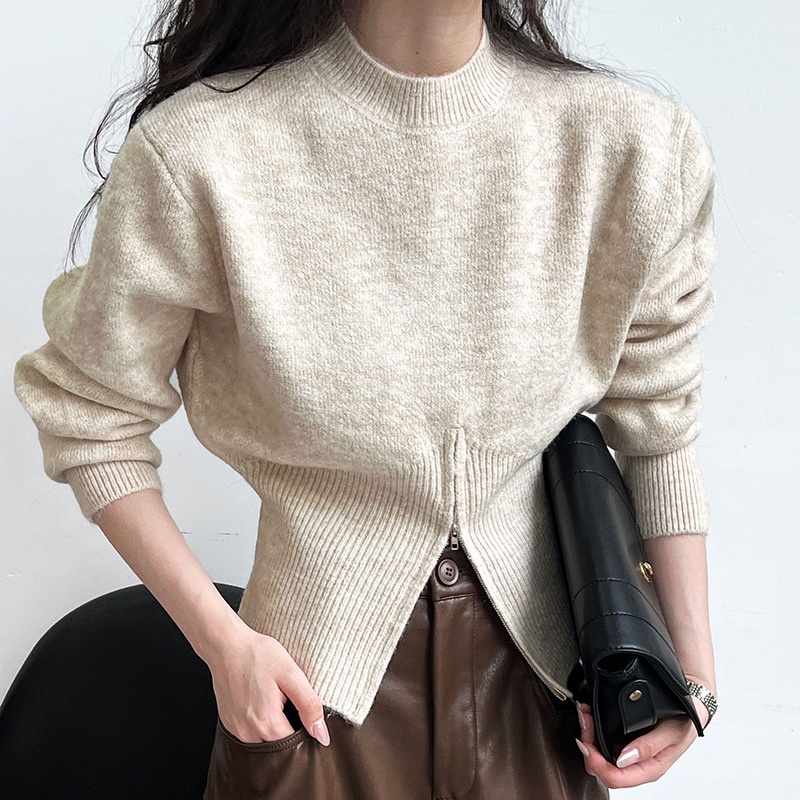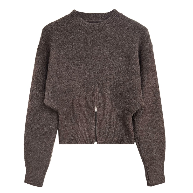 The picture shows a dark brown knitted sweater. It has a round neck design. The overall version is relatively loose. The length is near the waist and belongs to a short top. The characteristic of the sweater is that there is a slit in the middle of the hem and it also has zipper details, which increases the sense of design. This kind of sweater is simple yet not without personality. It is suitable for matching high-waisted pants or skirts and can show a casual and fashionable temperament. Wearing it in spring and autumn is both comfortable and beautiful. It can also be used as an inner layer in winter.