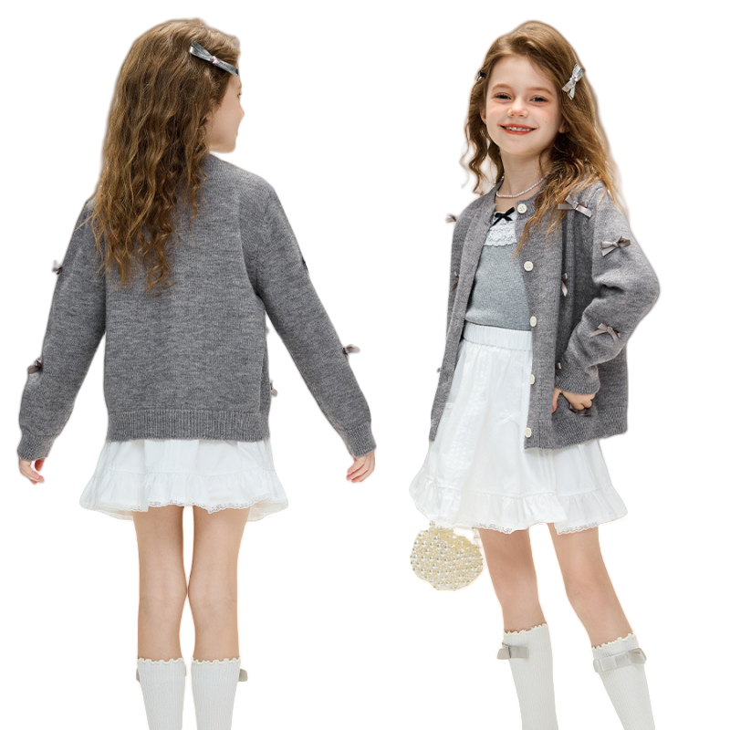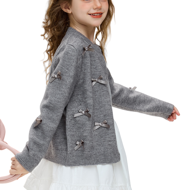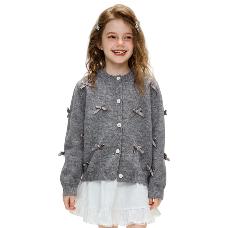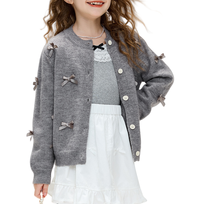 The surface of the garment is decorated with multiple gray bows, which are scattered and arranged neatly on the body and sleeves, adding a sweet and playful atmosphere to the simple gray cardigan, perfectly matching the cute temperament of little girls. The bow elements not only add visual interest but also highlight the detail design of the clothing, making the entire garment more attractive.
