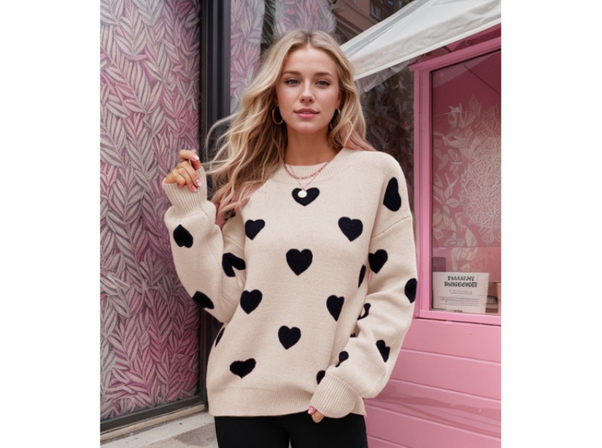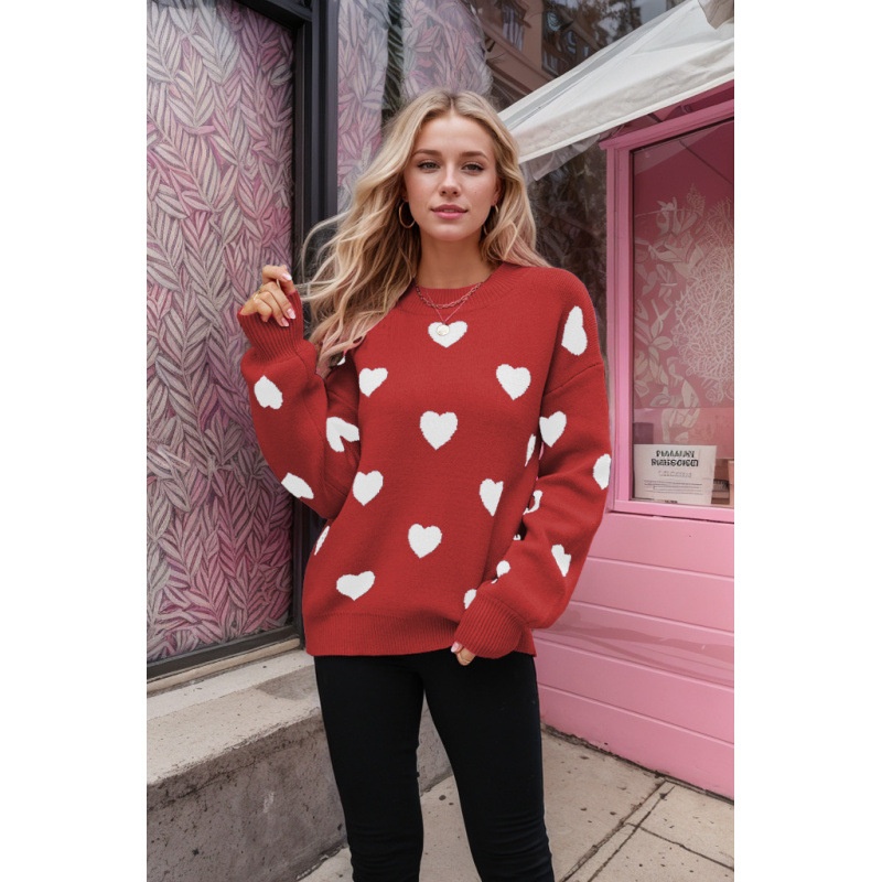 The sweater is made from a blended knit fabric of 45% combed cotton, 50% Acryl, Und 5% spandex. The addition of combed cotton retains the natural softness and skin-friendly feel of the fabric, preventing itching and ensuring good breathability, even when worn close to the skin. The acrylic component enhances the fabric’s warmth and anti-pilling properties, addressing the shortcomings of pure cotton sweaters (prone to pilling and insufficient warmth), while also improving color fastness. The red and white heart pattern remains vibrant even after multiple washes, without fading or color bleeding. The small amount of spandex provides moderate elasticity, allowing the sweater to fit the body better and offering unrestricted movement, while also preventing sagging and deformation over time. The fabric weight reaches 320g/m², making it a thickened knit fabric that provides ample warmth when worn alone or as a base layer in autumn and winter. The fabric also has a moderate drape, preventing it from appearing bulky despite its thickness. This sweater features a relaxed, oversized fit with dropped shoulders and a moderate length that perfectly conceals excess weight around the waist and hips, making it ideal for pear-shaped and apple-shaped figures. The dropped shoulder design softens the shoulder lines, creating a relaxed and casual look while allowing for greater freedom of movement without any tightness. The garment width is precisely tailored, maintaining a comfortable, loose fit without appearing overly baggy. It pairs well with skinny jeans or skirts, creating a flattering “wide top, narrow bottom” silhouette that optimizes body proportions.
