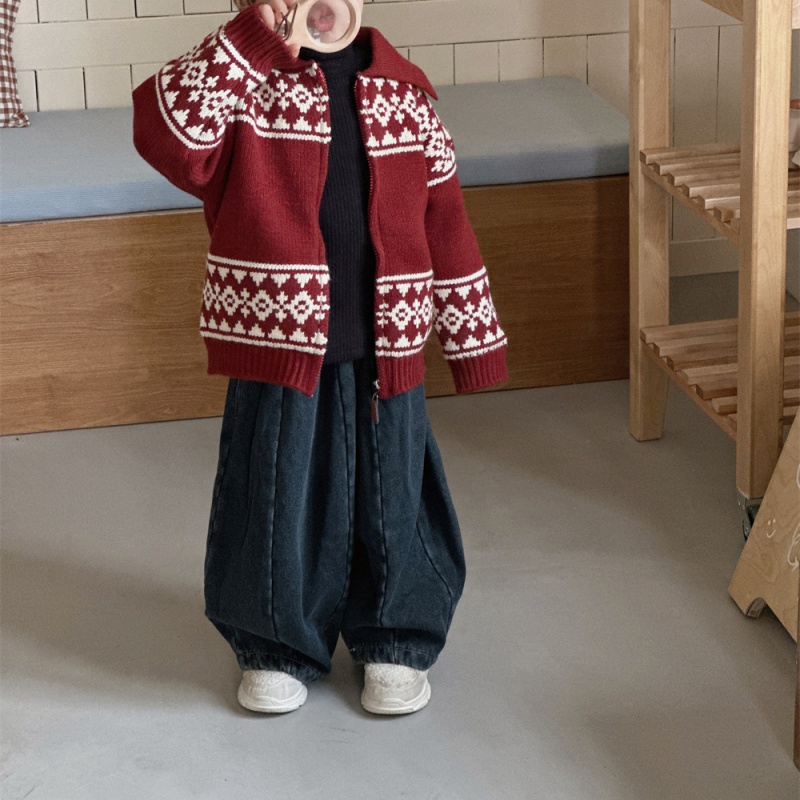 This is a children’s sweater in red with a button-down collar.. The cardigan is mainly in wine red, with a classic and textured look. The collar is designed as a turned-down one, adding a touch of neatness and playfulness. There are white geometric patterns decorating the garment, distributed on the shoulders and cuffs, jne. The design is simple yet retains a sense of design, adding details and highlights to the overall look.