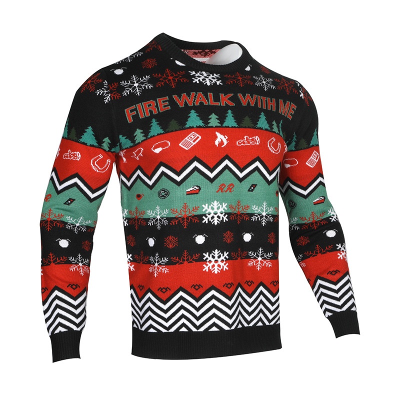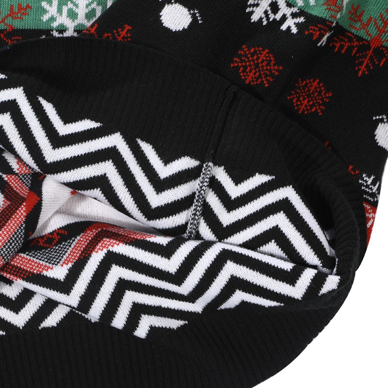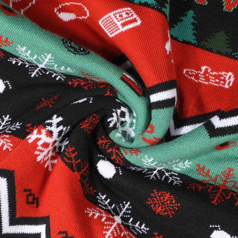 This Christmas sweater exudes a strong Christmas atmosphere. The main color is vivid, with a classic and passionate combination of red, green and black, which is the main color of Christmas decorations. It is adorned with rich Christmas elements: snowflake patterns fluttering around, like snowflakes falling in winter, bringing a pure festive atmosphere; Christmas tree patterns are emerald and upright, symbolizing vitality and hope; jagged lines are like the flickering light and shadow of Christmas lights, lively and playful. There are also small elements such as horseshoes and matches, as if they are small props from Christmas stories, making the entire sweater more story-like. Wearing it, you can feel that the joy, warmth and fantasy of Christmas are all on your body. Whether you attend a Christmas party or spend the festival with your family, you can perfectly blend into the festive atmosphere and become a prominent presence in the festival.